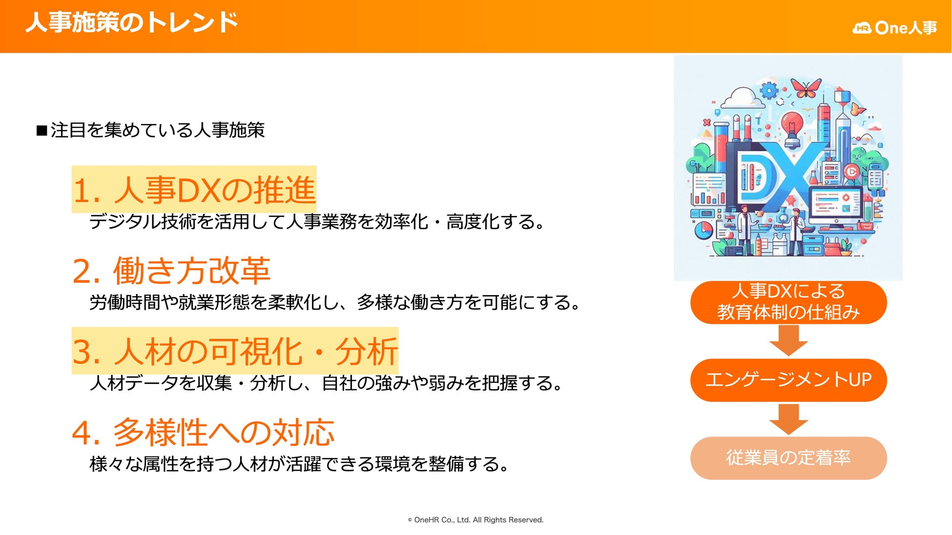 人材獲得競争が激化していく中、注目を集めている人事施策4点を解説します。1点目は、HRシステムを活用し人事業務の効率化を図る人事DXの推進。2点目、労働時間や就業形態を柔軟化し多様な働き方を実現する働き方改革。3点目は、自社の強みや弱みを把握するための人材データの可視化・分析。4点目が多様性への対応です。海外の方をはじめ、さまざまな属性を持つ人材が活躍できる環境を整備していく必要があります。いずれもポイントとなってくるのは人事DXです。人事業務を効率化し空いた時間で戦略人事に取り組むことで、教育体制の仕組み作りや従業員エンゲージメントの向上が可能になり最終的には人材の定着につなげていくことができるのではないでしょうか。