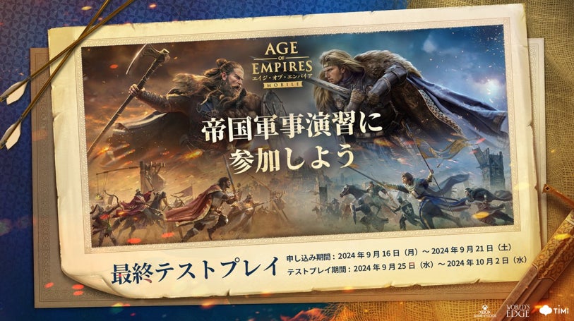 ただいま最終テストプレイ「帝国軍事演習」に参加していただけるプレイヤーを募集中です。下記URLのテストプレイ申し込みから、簡単なアンケートを記入いただくと抽選でテストプレイの参加権利を獲得できます。いち早くAoEモバイルを体験したい方はぜひご参加ください!