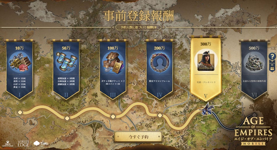 『AoEモバイル』は、10月17日(木)に世界同時リリース予定です。現在、App StoreおよびGoogle Playで事前予約を受付中です。ご予約いただいた皆様には、全世界の予約数に応じて豪華報酬をプレゼントいたします! お好みのプラットフォームで事前登録し、正式リリースをお楽しみにお待ちください。