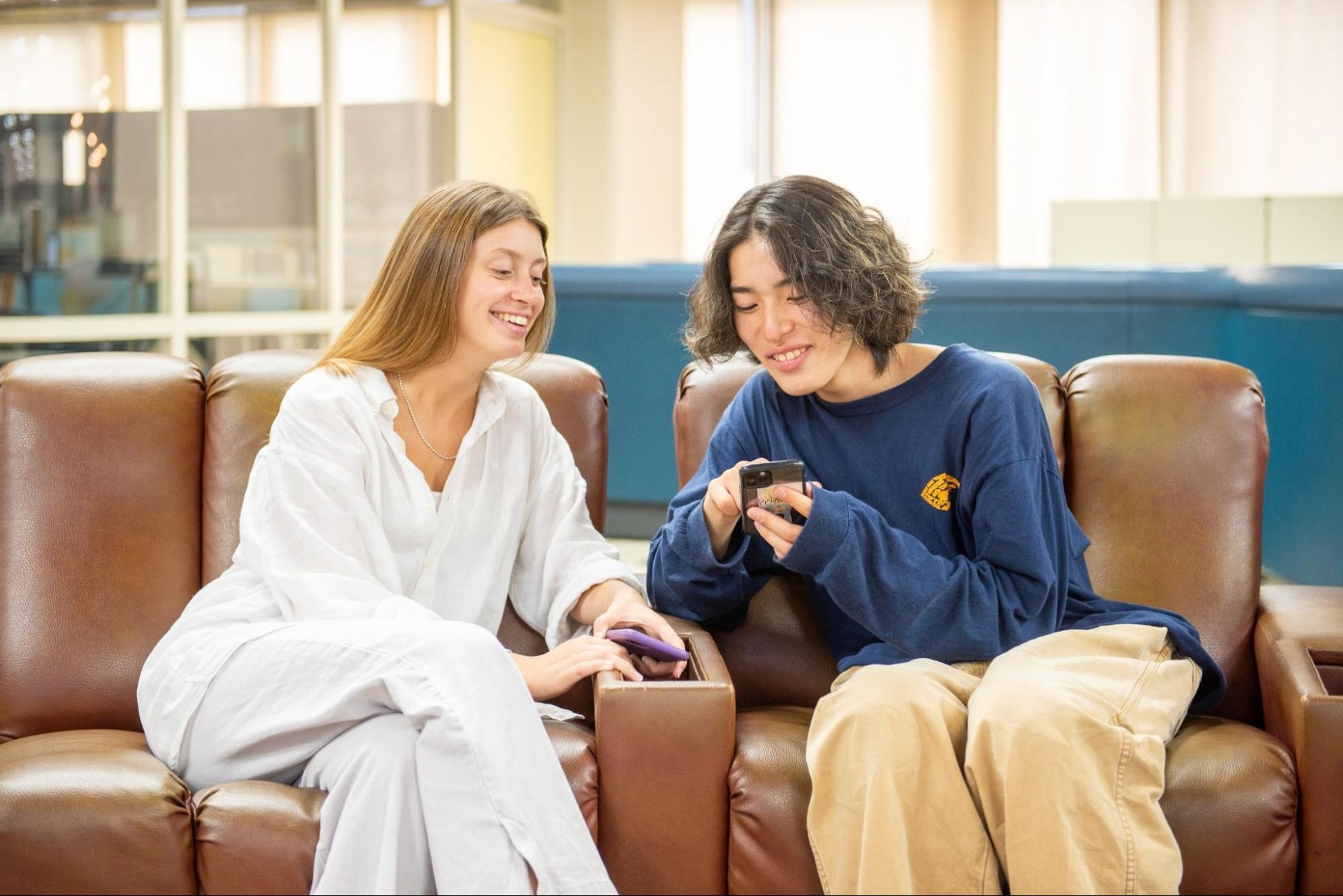 世界各国から名古屋商科大学に来日した留学生と在学生がペアとなり、お互いの言語を教え合うプログラムです。所属学部や学年に関係なく誰でも参加できます。教え合う言語は英語と日本語に限らず、フランス語、ドイツ語、スペイン語、中国語、ポルトガル語とさまざま。図書館やカフェテリア、ラウンジなど、キャンパス内のさまざまな場所で、一緒に語学学習したり交流をしているペアの姿が見られます。