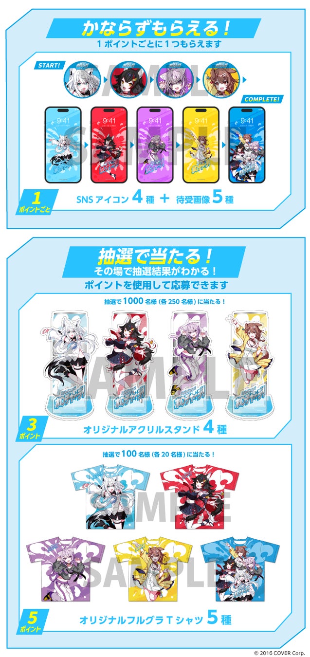例:累計3ポイントを保有した方は、SNSアイコン3種のダウンロードおよび、オリジナルアクリルスタンドの抽選に1回挑戦できます。