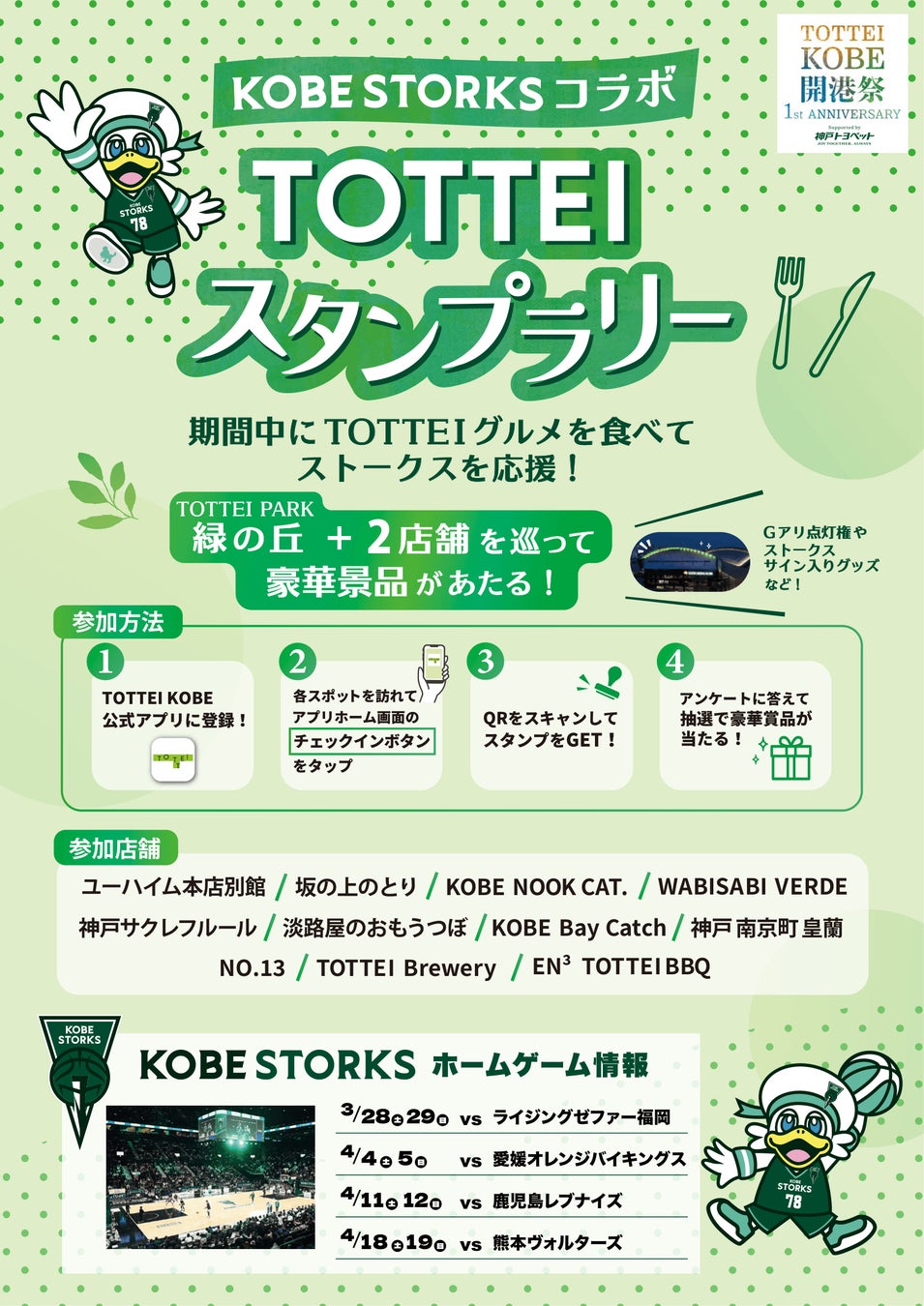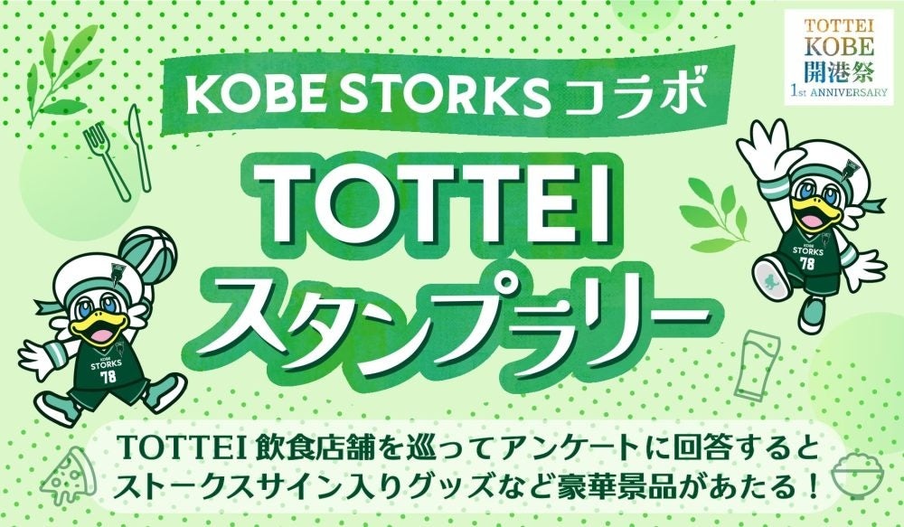 株式会社One Bright KOBE(住所:神戸市中央区、代表取締役社長 渋谷 順)は、TOTTEI開業1周年と、3月20日(金・祝)からの「TOTTEI KOBE 開港祭 Supported by 神戸トヨペット」開催を記念して、TOTTEI内のレストラン&カフェ店舗と神戸ストークスがコラボするTOTTEIアプリスタンプラリーを実施します。