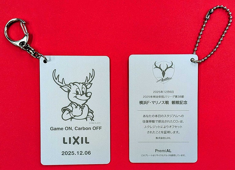 LIXILが推進する、住宅の高性能化(ZEH化)と“お得”な暮らしをサポートするサービス「建て得」から創出されたJ-クレジットを活用し、本試合におけるサポーターの移動で発生するCO2をオフセットします。1ゲート、NIPPON STEELゲート、3・5・6ゲートにて、来場者先着2万名様にリサイクルアルミ材「PremiAL」を使った観戦記念プレートをプレゼント。裏面はカーボンオフセット証明書となっています。ハーフタイムには、「J-クレジット活用 カーボンオフセットセレモニー」も実施します。