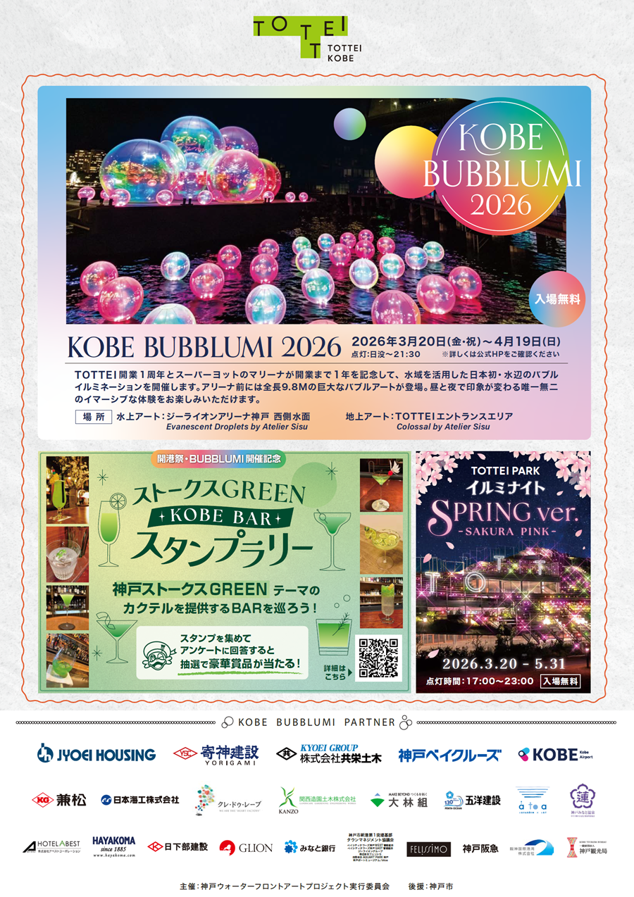 「KOBE BUBBLUMI 2026」は、GLION ARENA KOBEおよびTOTTEIの開業1周年とスーパーヨットマリーナ整備完了まで残り1年を記念して開催される、水辺空間を活用したイマーシブアートイベントです。新港第一突堤から第二突堤にかけてのエリアでは、シドニーを拠点に活躍するアーティスト「Atelier Sisu」によるバブルアートを展開。