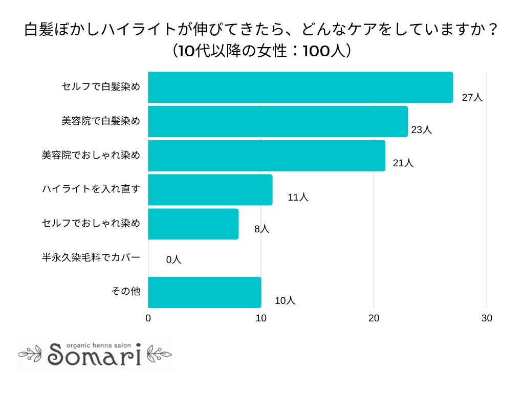 株式会社AWA(https://a-w-a.co.jp/)が運営する地域密着型白髪染め専門美容室ソマリ(https://a-w-a.co.jp/hennasalonsomari/)は、日本全国の10代以上の女性を対象に「白髪ぼかしハイライトが伸びてきたら、どんなケアをしていますか?」とアンケート調査を実施しました。