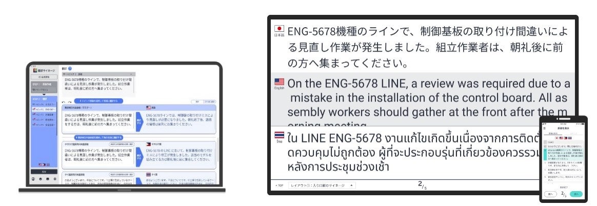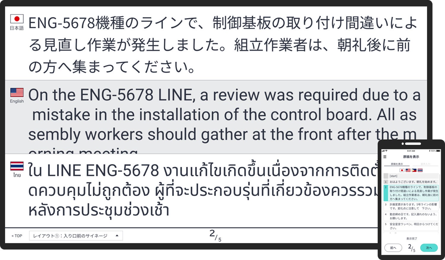 「翻訳サイネージ」は、日本語で作成した原稿を事前に多言語に翻訳し、工場の朝礼などで説明者が話すスピードに合わせて多言語でサイネージに同時表示することで、伝えたい内容をさまざまな言語で伝達できるアプリケーションです。これにより、外国籍従業員はその日の作業内容や注意事項を母国語で理解することが可能となり、作業品質や安全性の確保、モチベーションの向上などに寄与します。