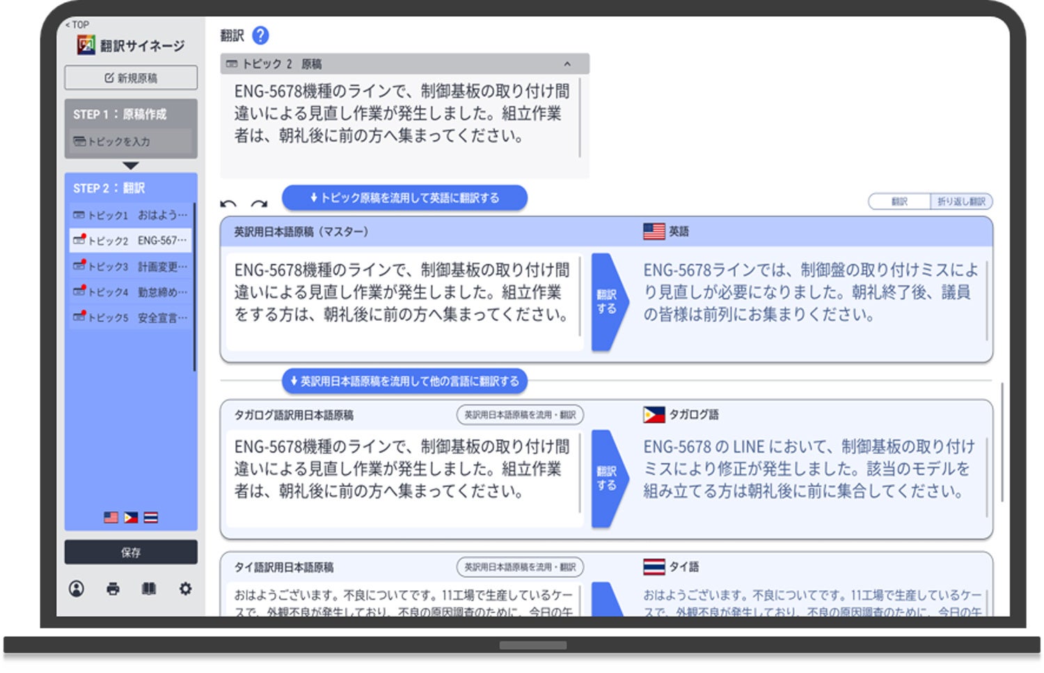 1.日本語で作成した原稿を多言語に一括翻訳し、朝礼などの集会でサイネージに同時表示することで、多様な国籍の従業員にそれぞれの母国語で内容を伝達