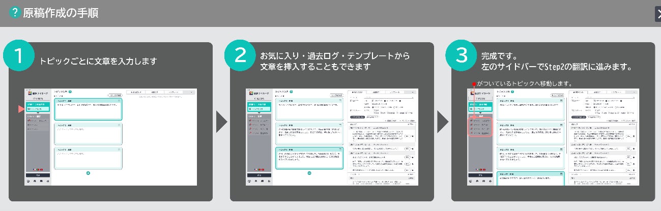 ・原稿作成や翻訳作業を行う画面にガイド画面を追加し、操作の流れを3ステップで簡潔に表示。これにより、操作が分からなくなった場合でも、画面内ですぐに確認が可能