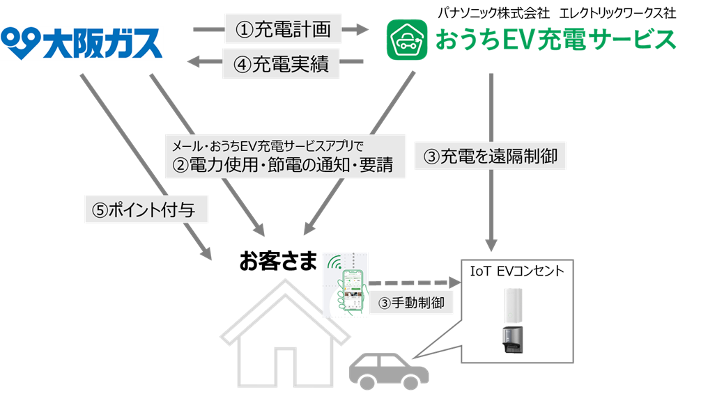 本実証では、2026年6月から12月までの期間、関西エリアの戸建住宅50世帯を対象に、大阪ガスの「節電オプション」とパナソニックが提供する 「おうちEV充電サービス」アプリ※2およびIoT EVコンセント※3を連携させ、遠隔でEV充電を制御します。
