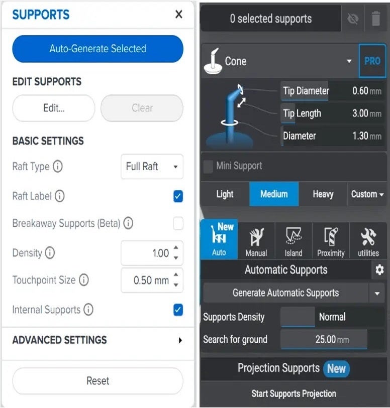 Formlabs製プリンターはPreformで、他のプリンターはLychee Slicerを使い、自動生成ツールを使用してサポートを生成、材料はメーカー推奨の設定を使用、積層ピッチは100μmに統一しました。