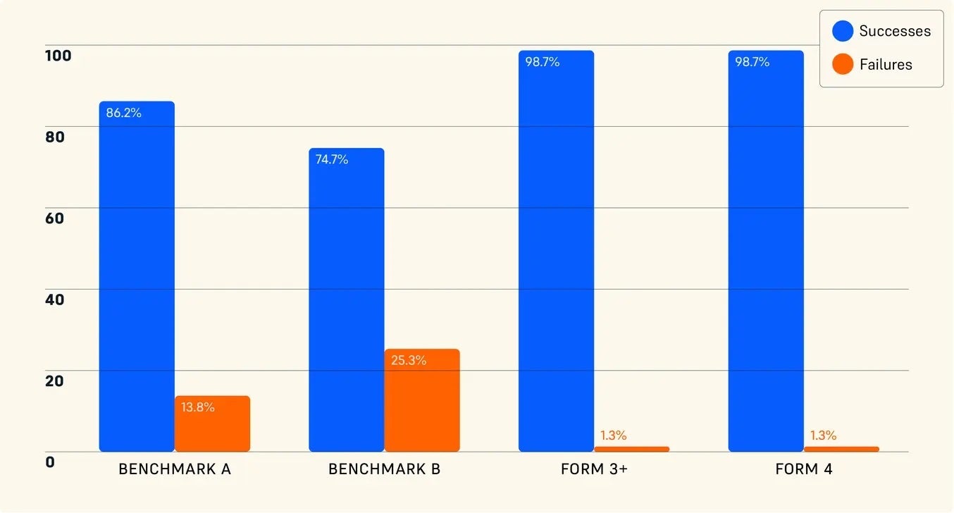 2024年にリリースされたForm 4 の印刷成功率は 98.7% と集計されました。これは、現場でのパフォーマンス向上の為に 5年間に渡り継続的に改良されてきた Form 3+ と同等です。ベンチマーク プリンター A と B の印刷成功率はそれぞれ 86.2% と 74.7% で、これは 13.8% と 25.3% の失敗率に相当します (Form 4 の場合は 1.3%)。これは、ベンチマーク プリンターの失敗率が Form 4 の 10 倍から 20 倍であり、ベンチマーク B では 4 回の印刷のうち 1 回が失敗していることを示しています。