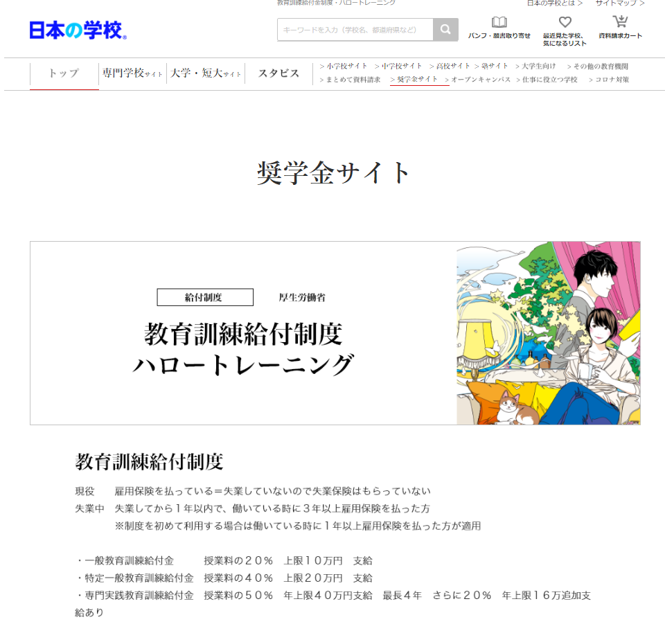 奨学金サイト「教育訓練給付金制度・ハロートレーニング」:https://school.js88.com/shogakukin/page11