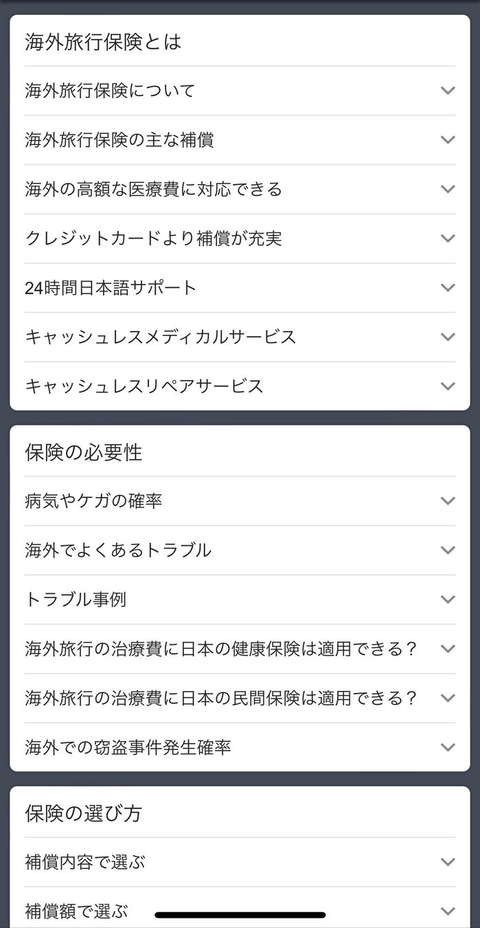 本サービスでは、海外旅行保険商品の比較だけでなく、海外旅行保険の主な補償や、保険の選び方、海外で起こりえるトラブルの事例、補償の目安、支払いの事例といった記事コンテンツも併せて掲載しています。海外での「万が一」に備えたい利用者が、予測できない旅先のリスクや自分に必要な補償を想定しやすくなっており、比較・検討の際に役立ちます。