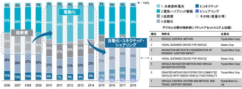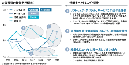 これら各特許のカテゴリをモビリティ業界の4大トレンドCASEに照らすと、Automated/Connectedは「デジタル化」、Sharedは「サービス化」、Electricは「低環境負荷」にそれぞれ対応する。