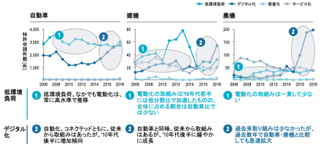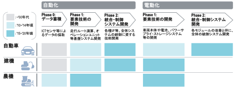 の順に進む。この中で、建機・農機は、分野により自動車を追従する形でのその技術開発が進んでいく傾向が見て取れる。農機・建機の技術開発トレンドの詳細については、次章以降で分析していく。
