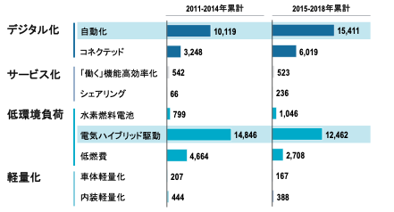 加えて、以上の価値分類をさらに細分化した9分類を見てみると、「自動化」・「電気ハイブリッド駆動(以下「電動化」)」の2軸が、出願数の観点で大きく抜きんでている。これら2軸は、いずれも未来のモビリティの標準装備として必要となりうる基盤技術であり、OEM・サプライヤー各社ともに、生き残りをかけて研究開発投資を進めている状況が見て取れる。