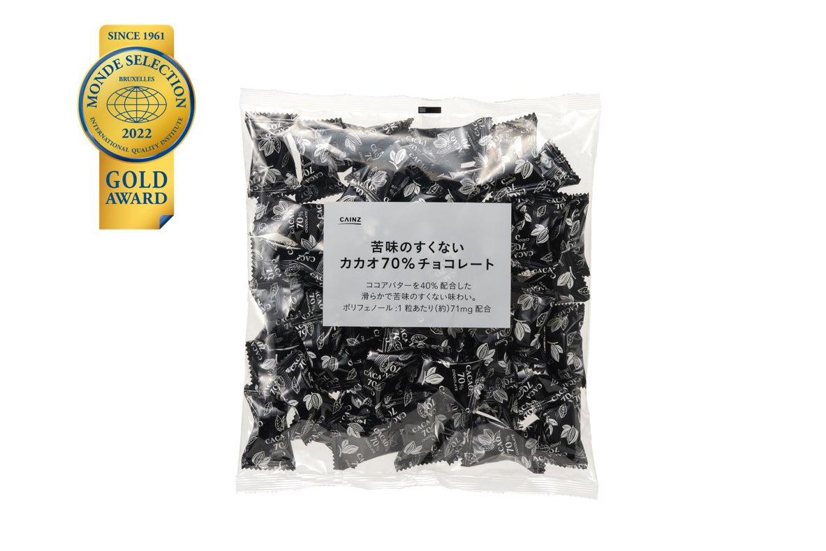 カインズの「苦みの少ないカカオ70%チョコレート」は、ココアバターの含有量を増やし、滑らかで苦みが少ないチョコレートを実現しました。苦みのあるチョコレートは苦手だという方にもおすすめできる商品です。1粒あたり約71mgのポリフェノールを配合した高カカオチョコレートを使用しています。家族みんなでシェアして食べるのもよし、リモートワークの小休憩にもピッタリの商品です。パッケージをシンプルに、お手頃価格で大容量サイズを実現しました。