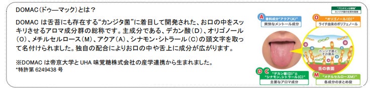舌苔(ぜったい)とは、細菌や食べかす、はがれた粘膜などが舌の表面に付着してできるもの。これが菌の温床となり、「口臭」の原因にもなります。「クロレッツ シタCLEAR」は、この舌苔に着目し、ガム史上初となる食品に含まれる成分からできたアロマ成分複合体の「DOMAC(ドゥーマック)」を配合。DOMACは、①口腔内のトラブルの原因ともいわれるバイオフィルムにアプローチ、②舌苔クリアをサポート、③舌キレイの持続パワー、の3つのチカラで舌表面の汚れにアプローチします。