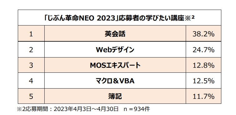 「じぶん革命NEO 2023」応募者の学びたい講座ランキング:1位は英会話(38.2%)、2位はWebデザイン(24.7%)
