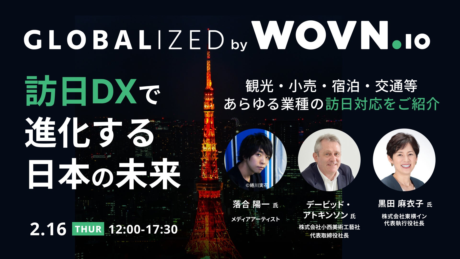 Web サイト多言語化ソリューション『WOVN.io(ウォーブン・ドットアイオー)』、アプリ多言語化ソリューション『WOVN.app(ウォーブン・ドットアップ)』を提供する Wovn Technologies株式会社(本社:東京都港区、代表取締役 CEO:林 鷹治、以下 WOVN)は、2023年2月16日(木)12時から『GLOBALIZED インバウンド 2.0』を無料開催します。東京のシンボルである東京タワーの真下に位置するスターライズタワー(東京タワーメディアセンター内)での会場開催の他、オンラインからも視聴いただけます。