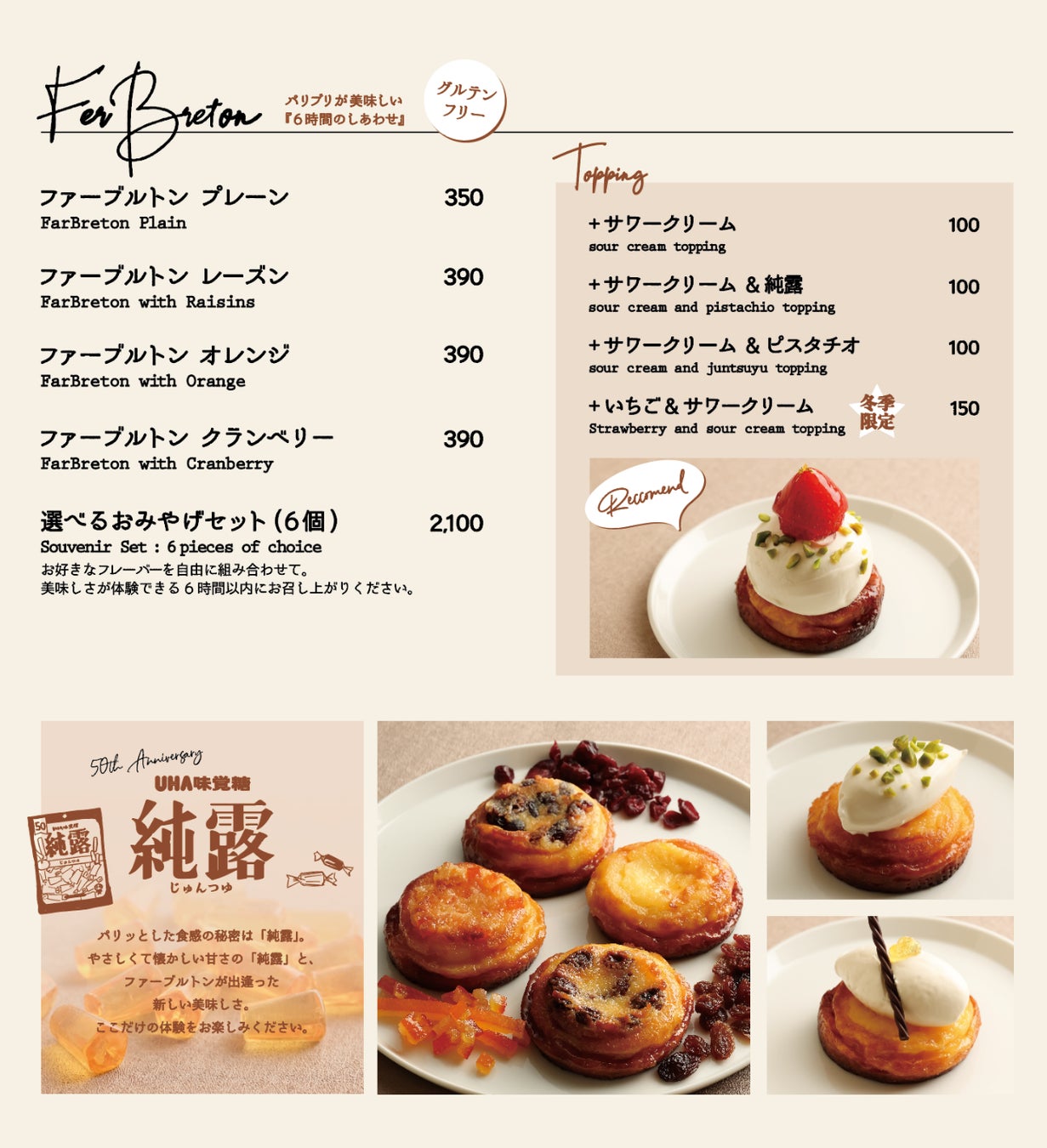 パリっとしてやさしくて懐かしい甘さは「純露」とのコラボでしか実現できないファーブルトンの魅力。そのまま食べても良し、サワークリームやフルーツなどトッピングする新しい食べ方にも、「純露」はおいしさを引き立ててくれます。