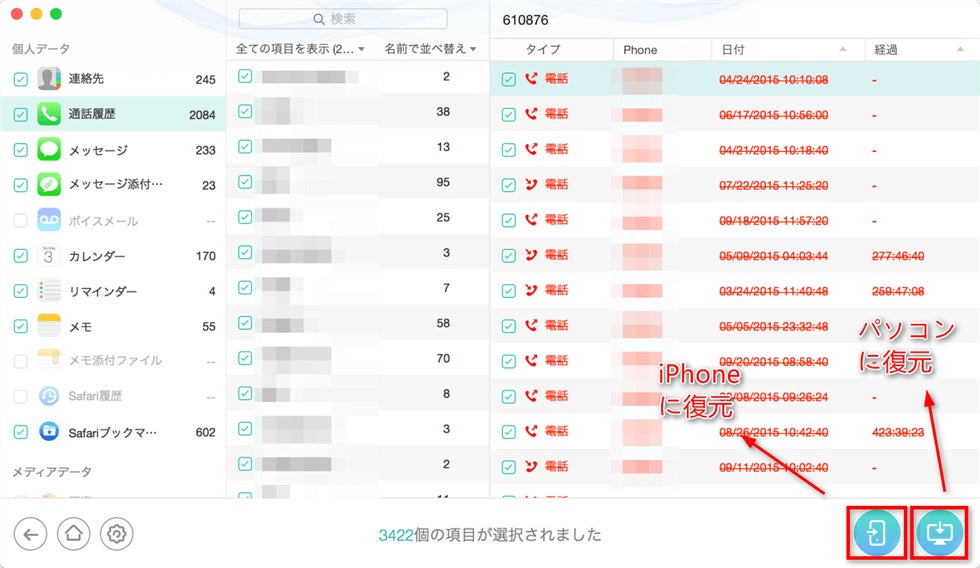 - 連絡先/メッセージ/メモ/Safari履歴/Safariブックマークなどの個人情報、写真などを直接に復元できる