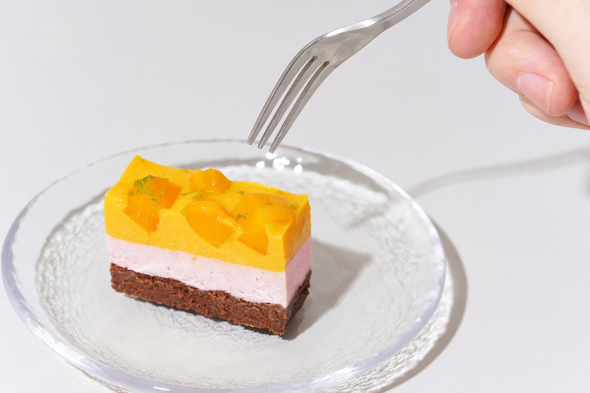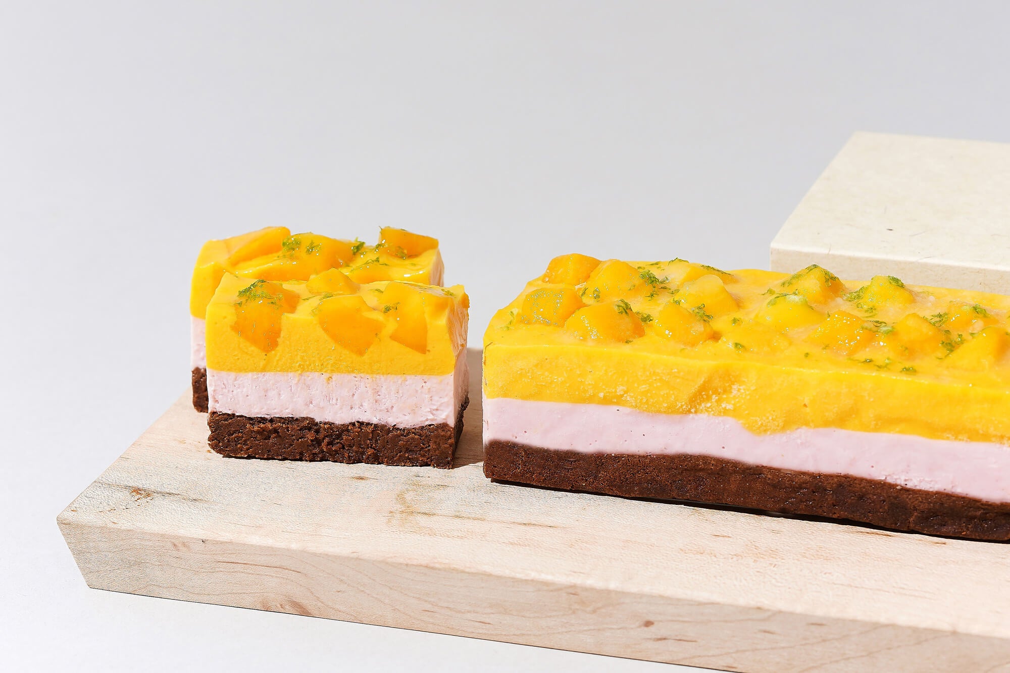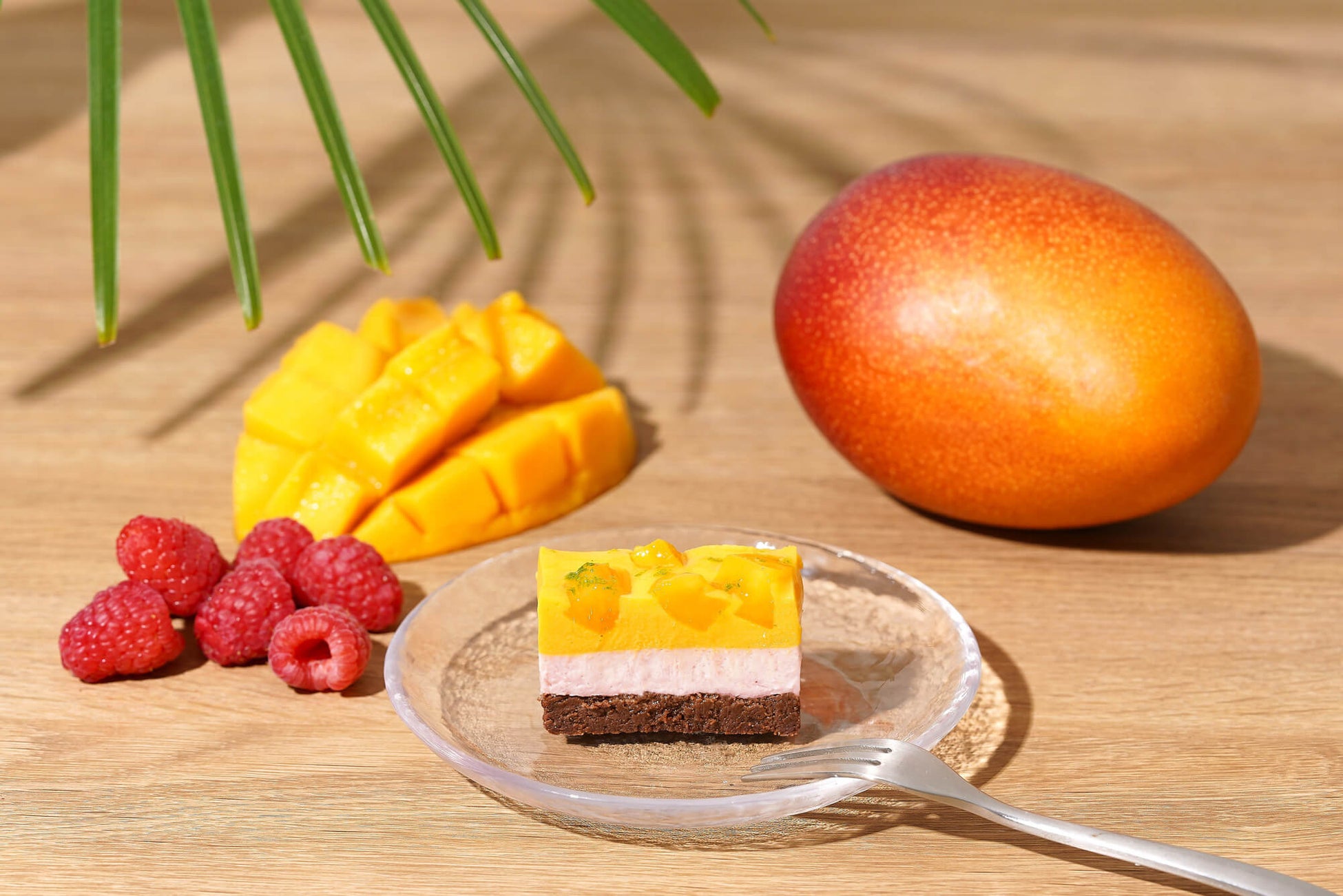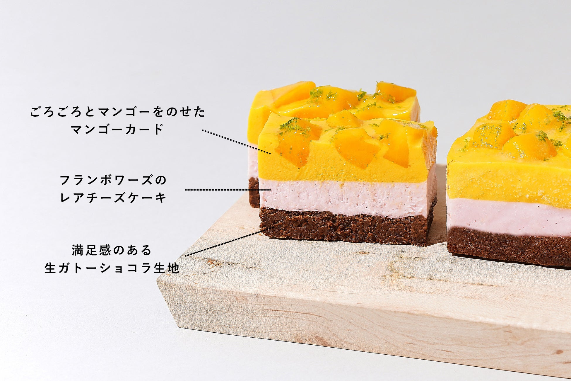 濃厚でスッキリとした甘さとマンゴーを主役に、フランボワーズのレアチーズケーキと生ガトーショコラ生地の3層でお楽しみいただける夏季限定のガトーショコラをご用意しました。