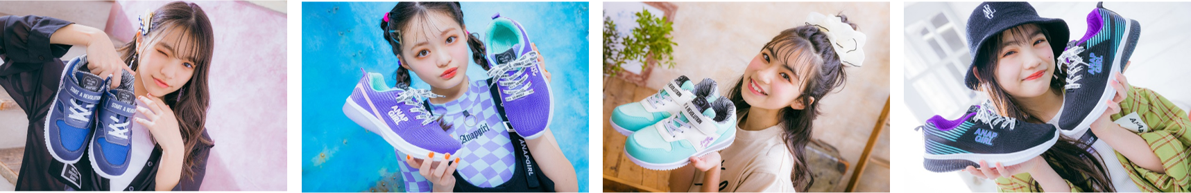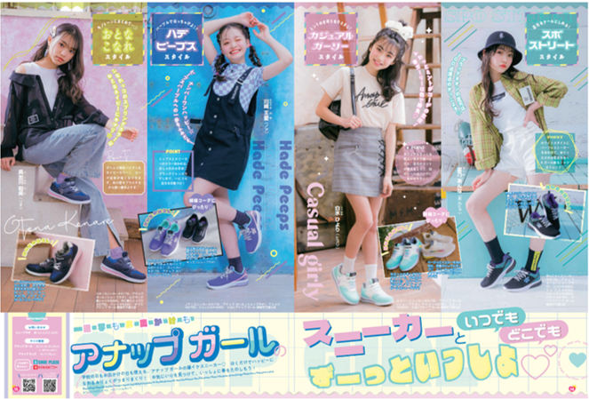 今回発売されるアイテムは、パープルやネオンカラーなどの「スポストリートスタイル」、爽やかなミントカラーにチラッと見えるゼブラカラーがおしゃれな「カジュアルガーリースタイル」、鮮やかなパープルが今旬な「ハデピープススタイル」、落ち着いたネイビーが優等生風にキマる「おとなこなれスタイル」といった4つのスタイルを、誌面でも人気の専属モデルの4人が、それぞれの個性にあわせて着こなしてくれています。また、今回誌面では新発売となるアナップ ガールの妹分アナップ キッズも登場します。お姉さんとの姉妹コーデもお楽しみください。新学期、新年度は、履くだけでハッピーになれる人気のアナップ ガールの新作スニーカーで気分をアゲていきましょう。
