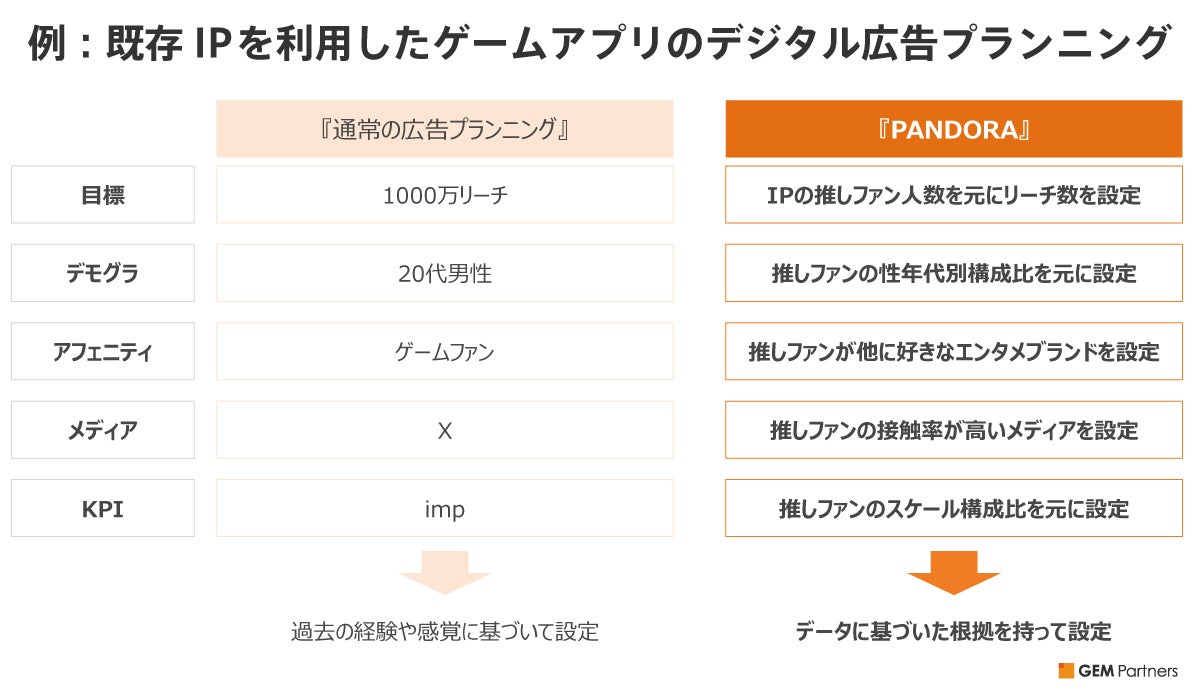 エンタテイメント業界に向けたデータ×デジタルマーケティングサービスを提供するGEM Partners株式会社はこのたび、エンタメ商材向けデジタル広告&マーケティングプランニングロジック『PANDORA』を確立し、提供を開始いたしました。『PANDORA』では自社が保有する約3万のエンタメブランド・データベースを基に、デジタル広告のプランニングを行うことで感覚や先入観に頼らない、ターゲットとすべきオーディエンスへ確実に広告を配信することが可能です。