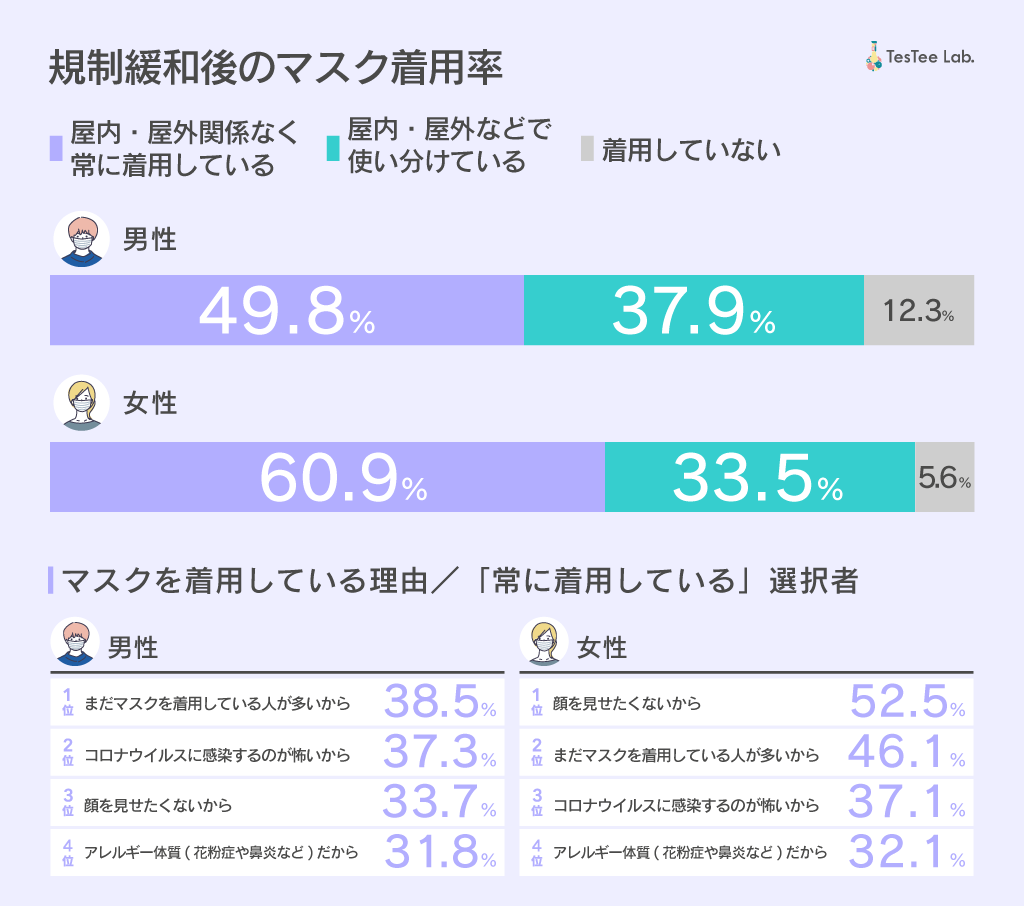 - 規制緩和後のマスク着用率は男性5割、女性6割。マスクをする理由は「マスクをする人の多さ」と「素顔を見せることへの抵抗感」