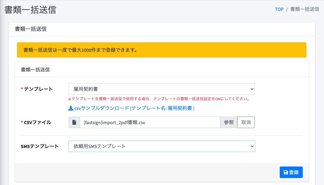 例えば「雇用契約書を一括で大量に送りたいけど、1人ずつ送信するのは手間がかかる...」といったシーンでも、CSV一括登録機能を使えば一気に送信が可能です。