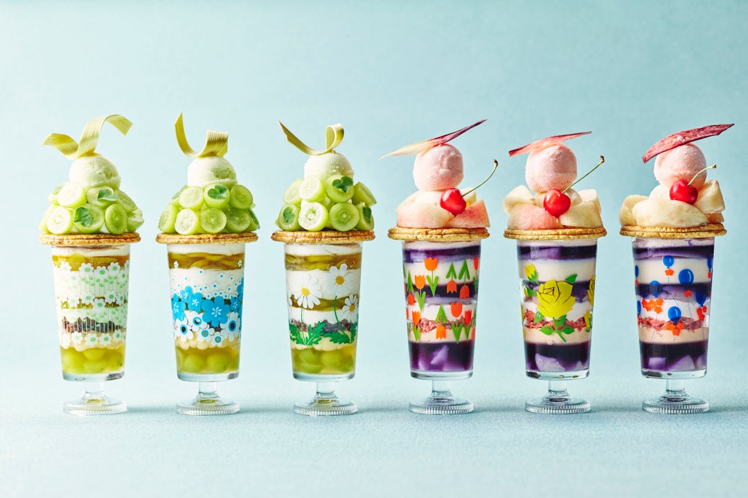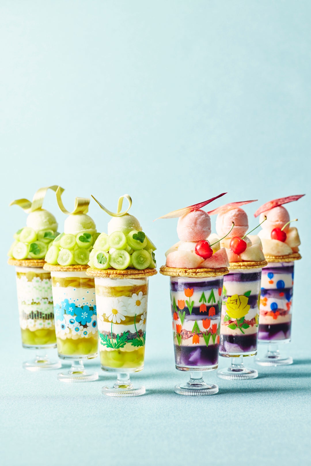 今夏のパフェはアデリアレトロとコラボレーション!キュートでカラフルなグラス6種にフレーバーティーがエレガントに香る、2種のサマーフルーツパフェをご用意しました。