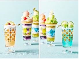 新しくて懐かしい、昭和レトロなアデリアレトロのグラスで提供するパフェは夏限定のスペシャルなスイーツタイムをお届けします。パフェとペアリングのモクテルもどうぞ。