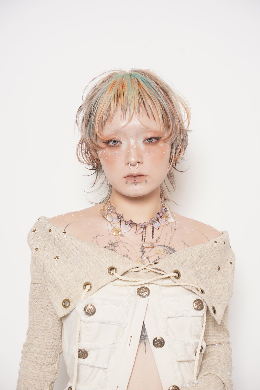 今回のテーマ“オートクチュール”にあわせて、普段のトレンドを意識した作品づくりではなく、モデル一人ひとりに似合わせた新しいスタイルを考えました。バージン毛からブリーチを重ね、黒のグラデーションをつくり、さらに脱染の位置をコントロールしながら一つひとつ色を入れていく。まるで職人が服にビーズやスパンコールを一つひとつ縫い付けるような感覚で、ヘアに落とし込みました。