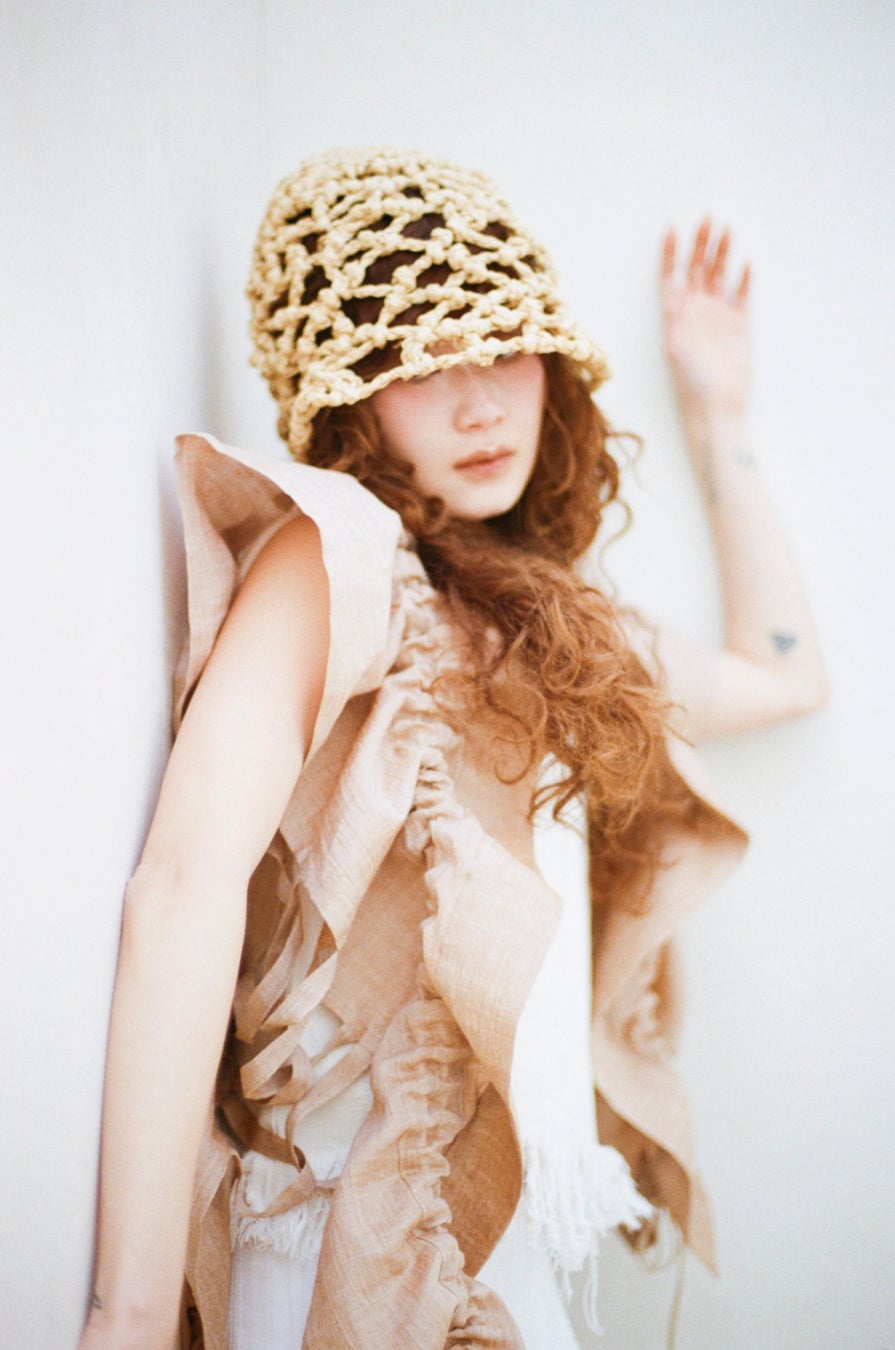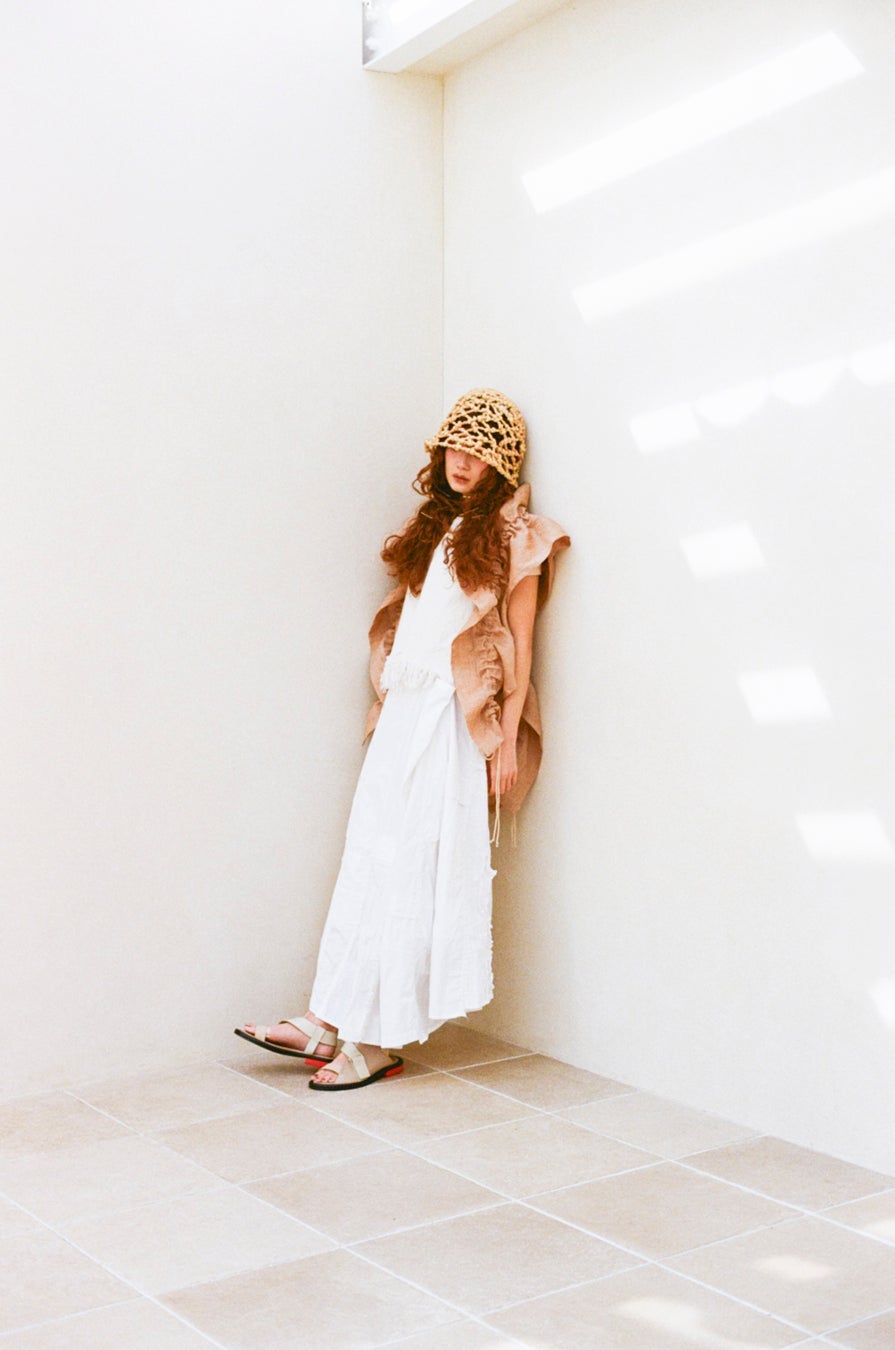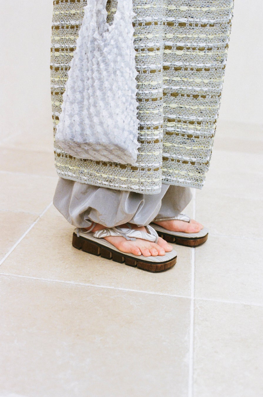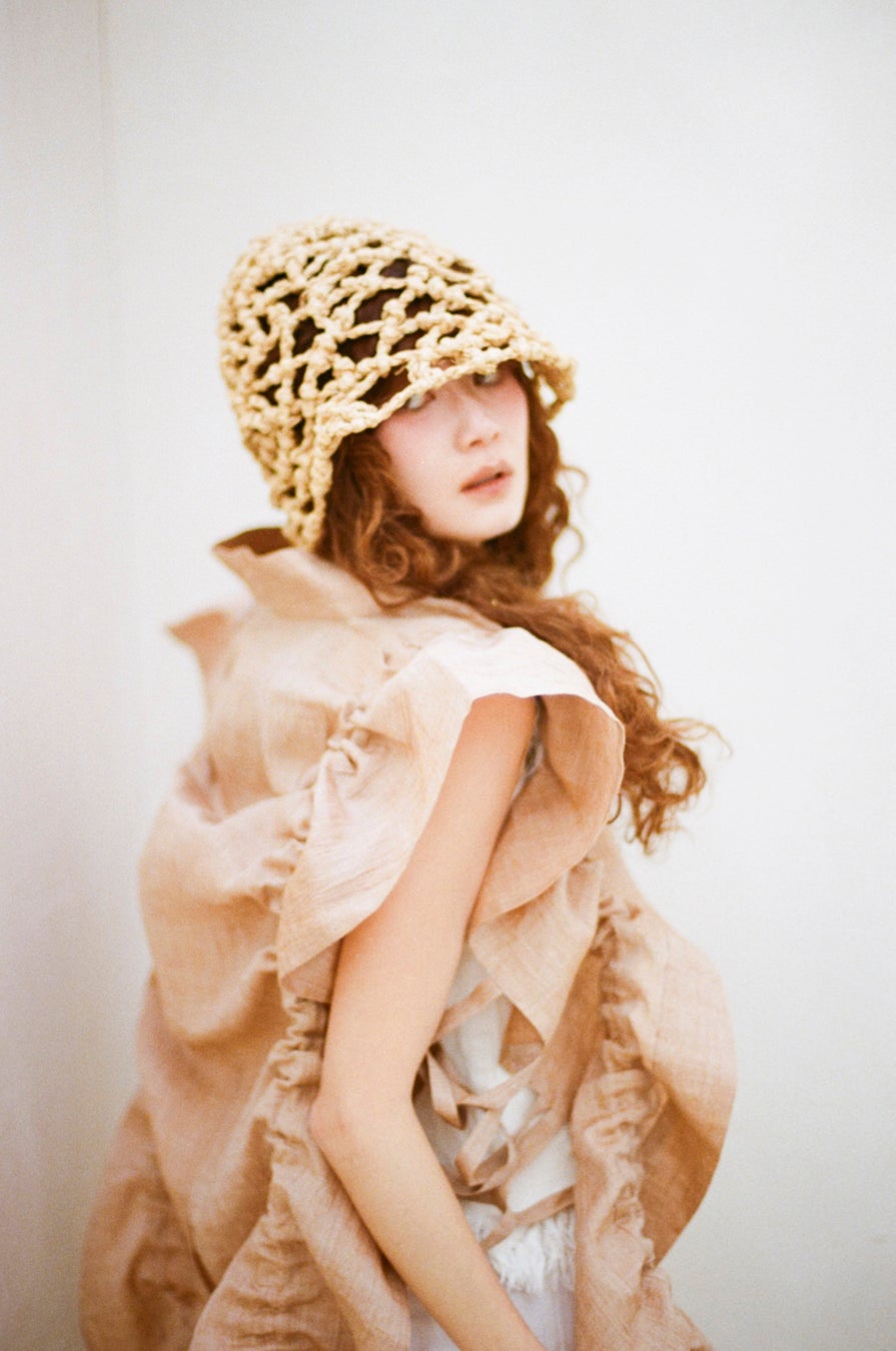 全体はニットならではの柔らかさと表情が楽しめるよう糸を1種類にし、裾部分には2種類の糸を混ぜてフリンジをボリュームアップ。歩くたびにひらひらと動くのもポイントです。これまでにない薄手で透け感のあるデザインが特徴で、透かし編みの形状や大きさにもこだわり、軽やかな印象を大切に仕上げています。