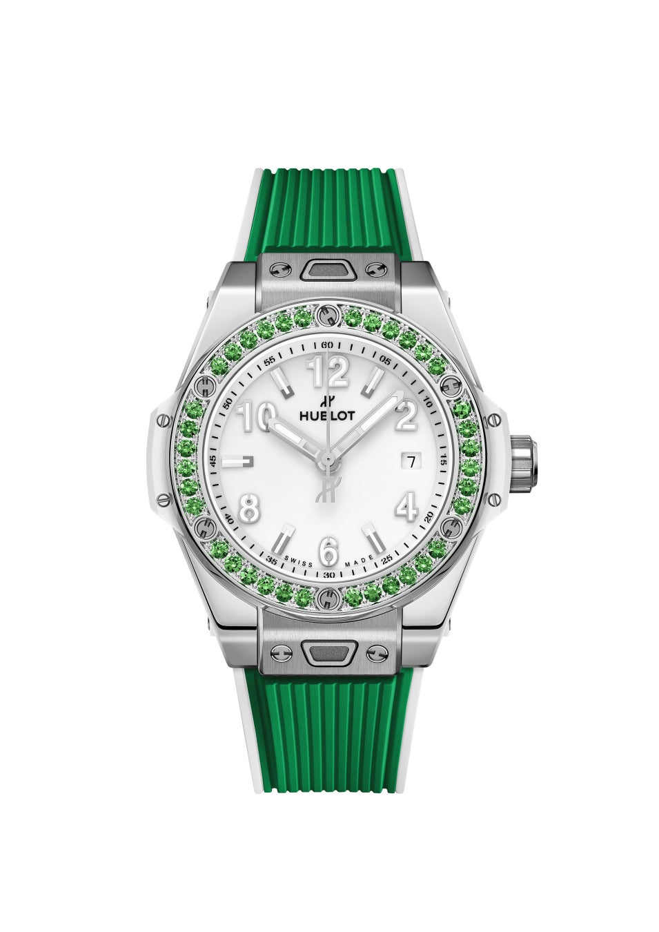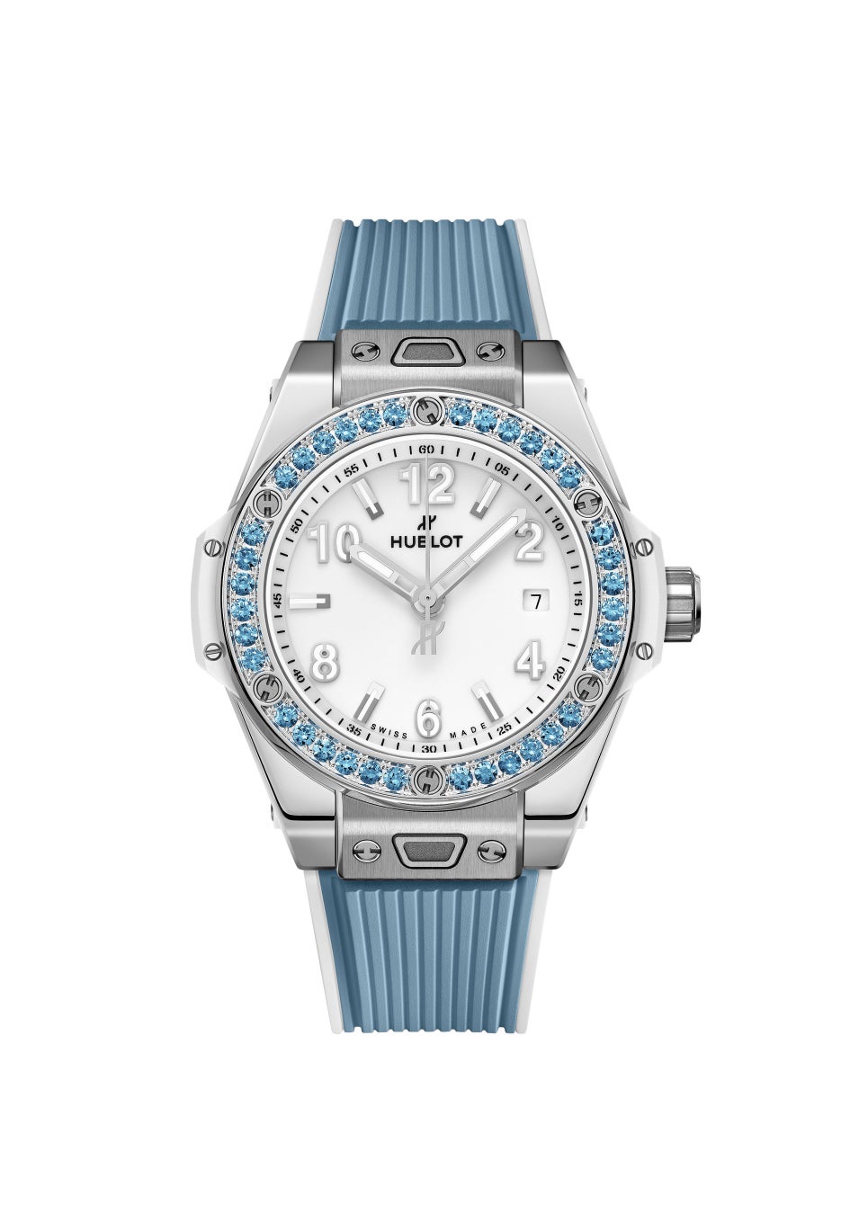 「ビッグ・バン ワンクリック ジョイフル」の各モデルは、ケースサイドのホワイトコンポジットと調和するホワイトライニングのラバーストラップが付属しており、「ビッグ・バン」のレイヤー構造を際立たせています。ストラップの中央には、ジェムストーンと同色のラバーインサートが施されています。さらに、同色で一層 鮮やかなトーンのストラップも付属し、ケースに搭載された特許取得済みの「ワンクリック」システムによって、簡単にストラップを交換することができます。