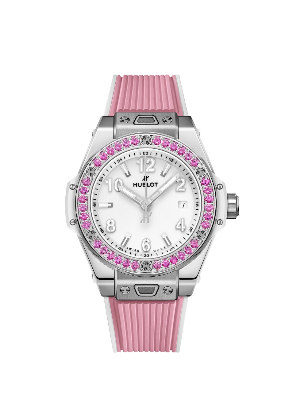 ウブロは、「ビッグ・バン ワンクリック」33mmの新作「ビッグ・バン ワンクリック ジョイフル」を発表しました。5種のカラーストーンと、それに合うカラーストラップを組み合わせた、このシリーズで初めてのモデルです。レッドスピネル、オレンジサファイア、ピンクサファイア、ブルートパーズ、ツァボライトがそれぞれのベゼルに美しくセットされています。