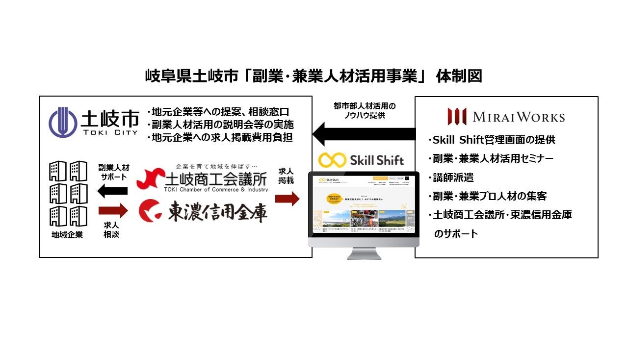 土岐商工会議所と東濃信用金庫が、経営課題を抱える企業に、『副業・兼業プロ人材の活用』をご紹介し、企業は経営課題を解決するための求人情報を『Skill Shift』に掲載します。土岐市は事業推進のために、本来、『Skill Shift』の利用にかかる求人掲載費用の全額を負担します。当社は、『Skill Shift』管理画面の提供、副業・兼業人材活用セミナーの開催、副業・兼業プロ人材の集客、副業・兼業プロ人材活性化のサポートを実施し、今後、本仕組みの定着・自走化を進めていくための足掛かりとして、プロジェクトをサポートいたします。