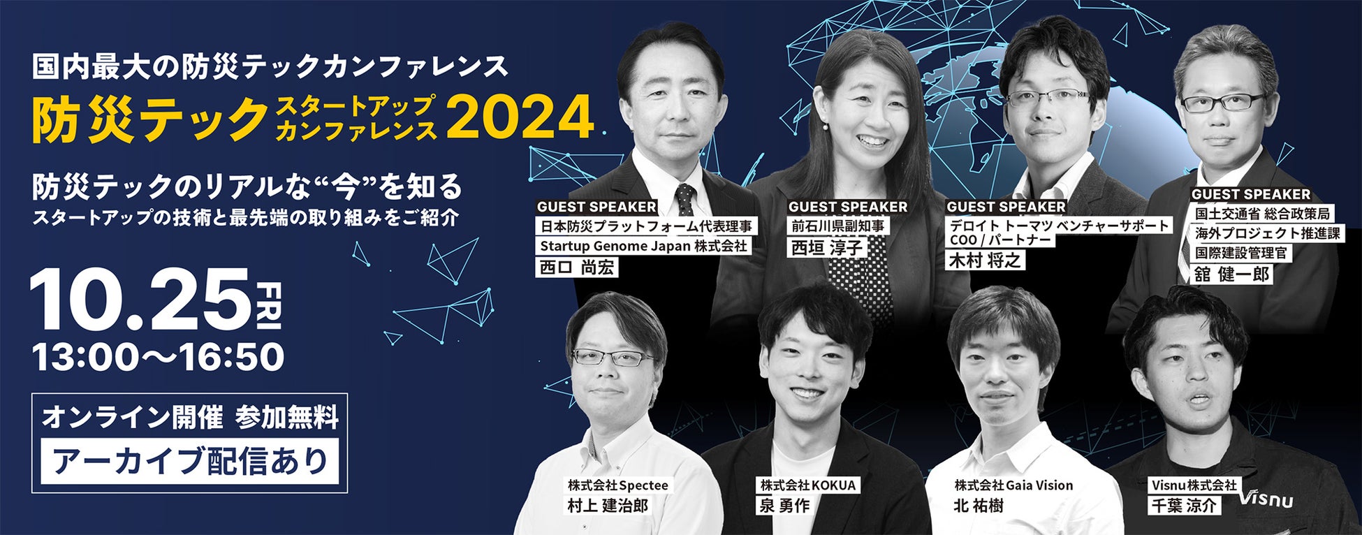 本イベントにおいて、前石川県副知事の西垣淳子氏、日本防災プラットフォーム代表理事の西口尚宏氏、デロイトトーマツベンチャーサポートCOOの木村将之氏、国土交通省 総合政策局 海外プロジェクト推進課 国際建設管理官の舘 健一郎氏のゲスト登壇が決定しました。