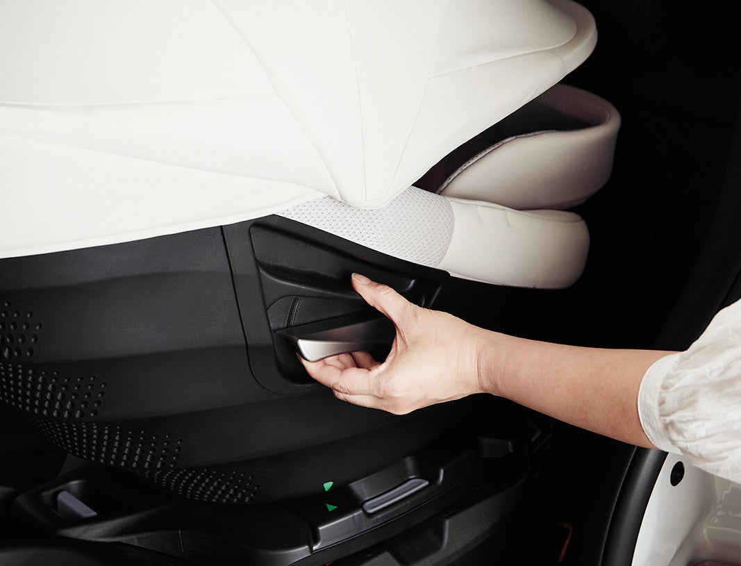 これまで好評だった回転操作ノブをお子さまの足元からシート側面に移動し、レバータイプに変更。2ドア車や狭い駐車場での操作性も向上、車種やシーンに関わらずストレスなく使うことができます。レバーは両サイドにあるため、左右どちらの座席にチャイルドシートを取り付けても使用できます。