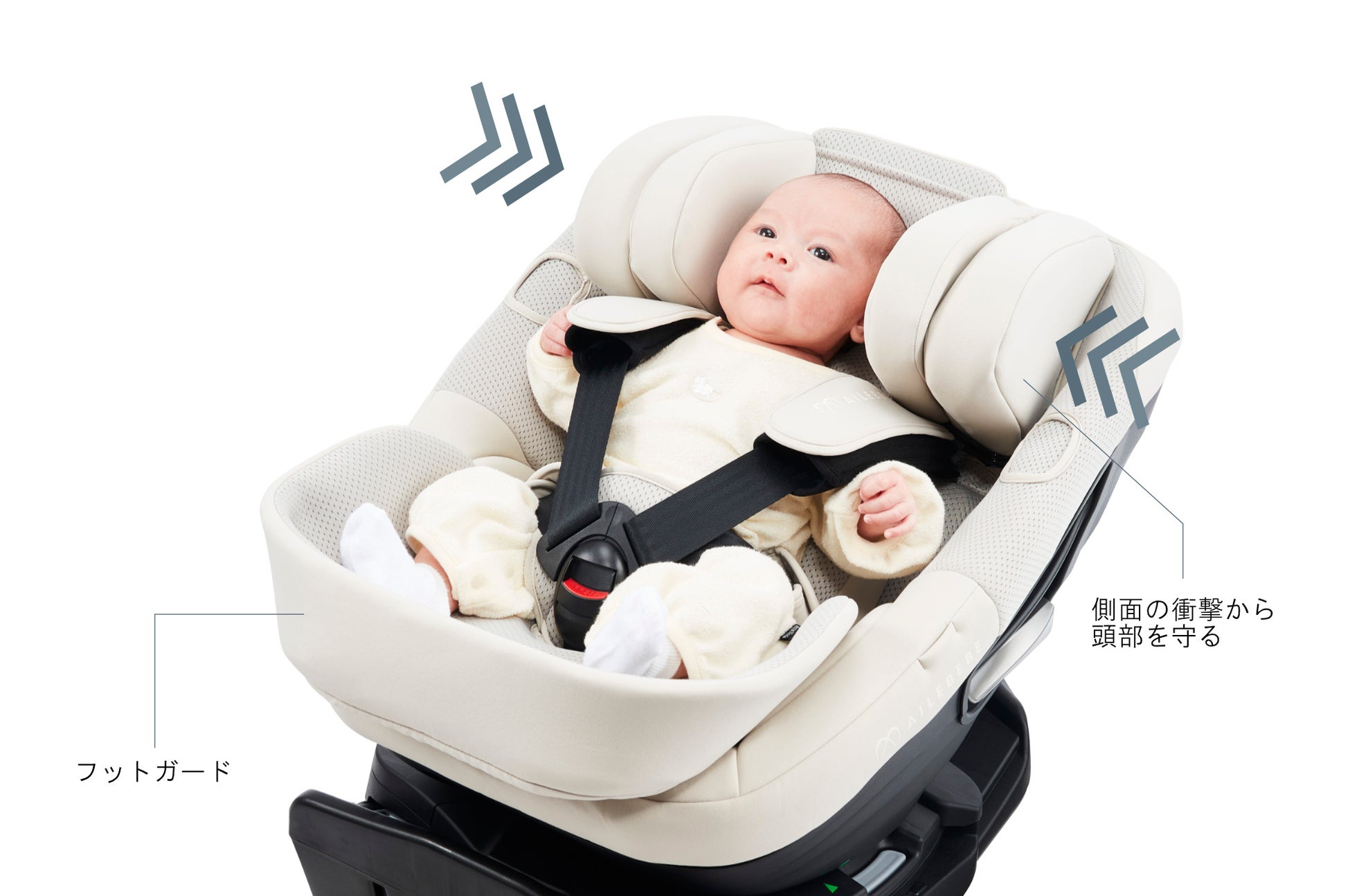 頭部側面60mm、後頭部最大90mm、背面最大100mmの厚みのあるクッションで、安全性と乗り心地を両立した新生児クッション。頭まわりには、側面の衝撃から頭部を守る衝撃吸収クッションを配備しています。足元は赤ちゃんの足を優しく守るフットガード形状になっています。