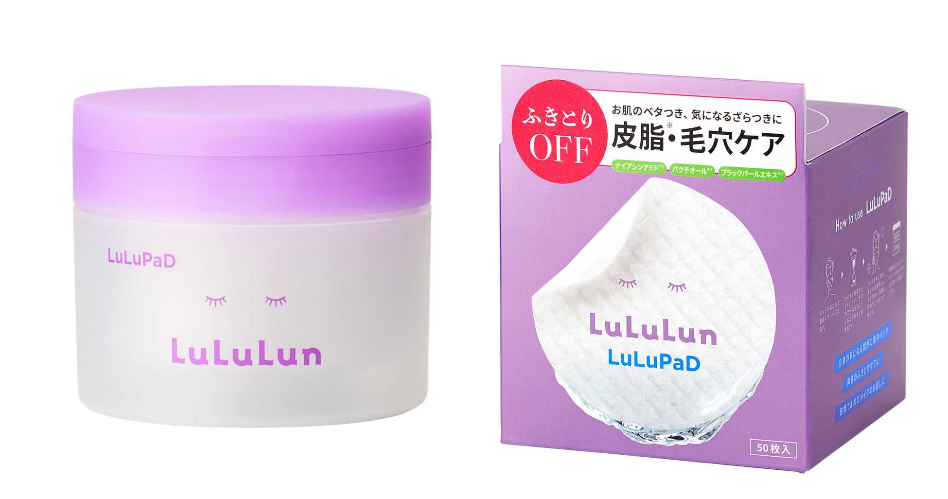 「ルルルン トナーパッド ふきとりOFF」…余分な皮脂や角質などのざらつきが気になるかたへ。パッドの凹凸面でサッとふき取ることで、手軽にOFFします。バクチオール*1とナイアシンアミド*1を配合し、ふき取った後のお肌もしっとりと保湿します。