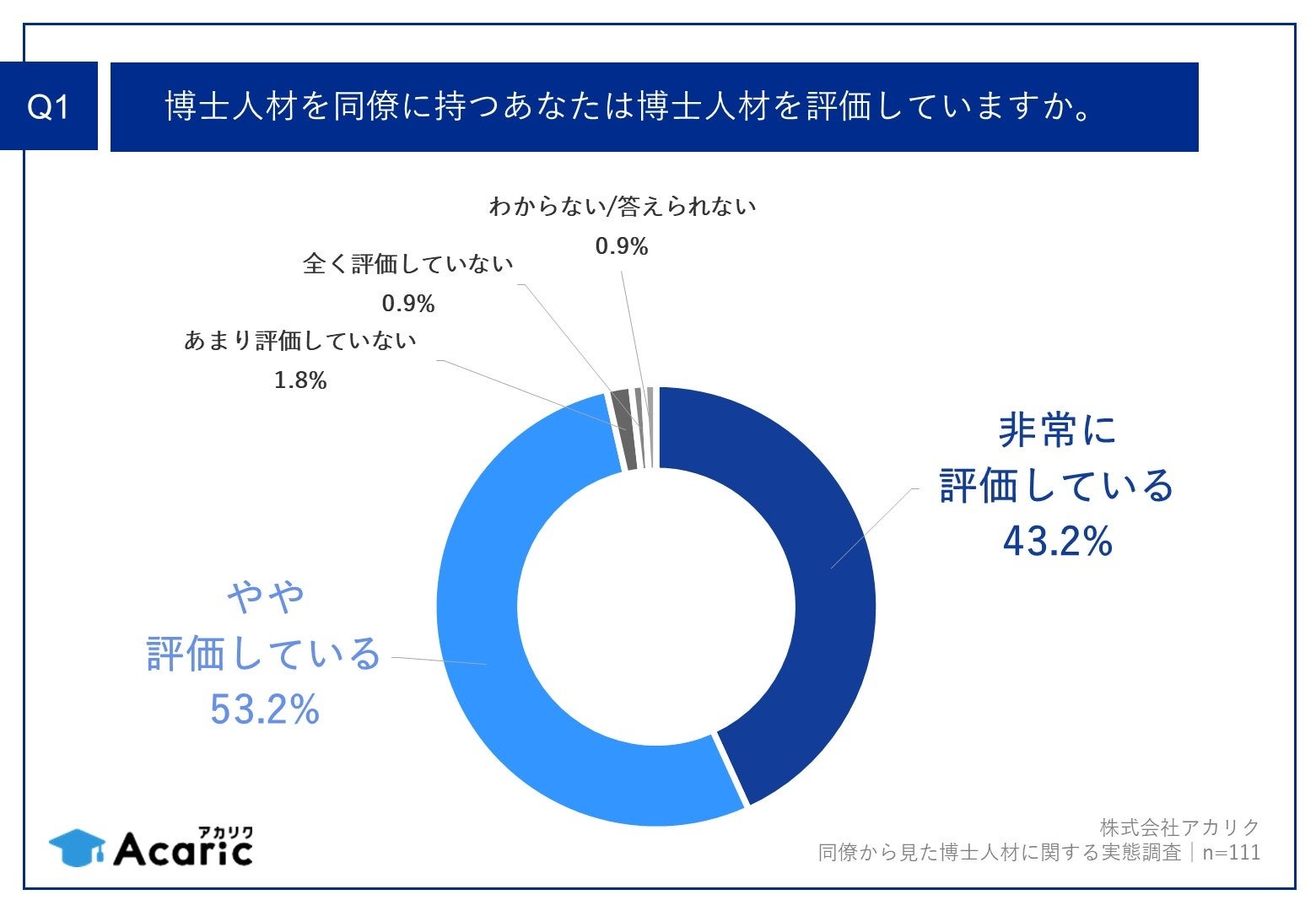 「Q1.博士人材を同僚に持つあなたは博士人材を評価していますか。」(n=111)と質問したところ、「非常に評価している」が43.2%、「やや評価している」が53.2%という回答となりました。