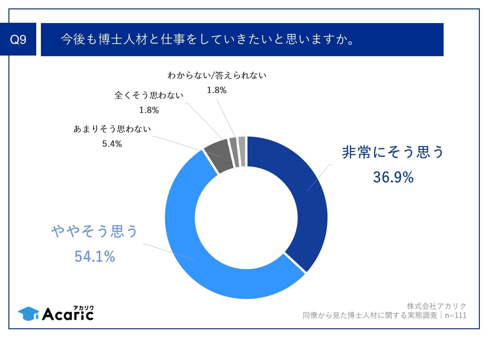 「Q9.今後も博士人材と仕事をしていきたいと思いますか。」(n=111)と質問したところ、「非常にそう思う」が36.9%、「ややそう思う」が54.1%という回答となりました。