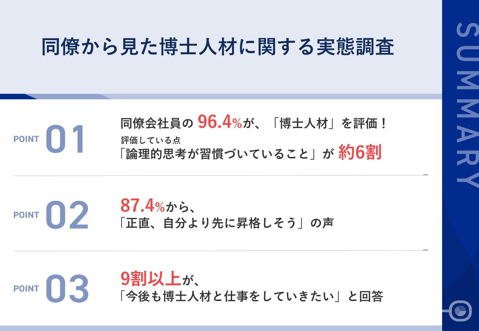 まず、博士人材を同僚に持つ会社員の96.4%が、博士人材を評価しており、その具体的な理由として、「論理的思考が習慣づいていること」(56.1%)、「研究遂行能力が高いこと」(38.3%)、「知的好奇心が強いこと」(37.4)が挙がりました。また、博士人材の良さを感じる場面としては、「雑談をするとき」と「情報収集をするとき」がそれぞれ47.7%で最も多く、続いて「人から引き受けたタスクに対応しているとき」が38.3%という結果になりました。最後に、87.4%の回答者が「博士人材が自分より先に昇格しそう」と感じており、91.0%が「今後も博士人材と仕事を続けたい」と回答しています。
