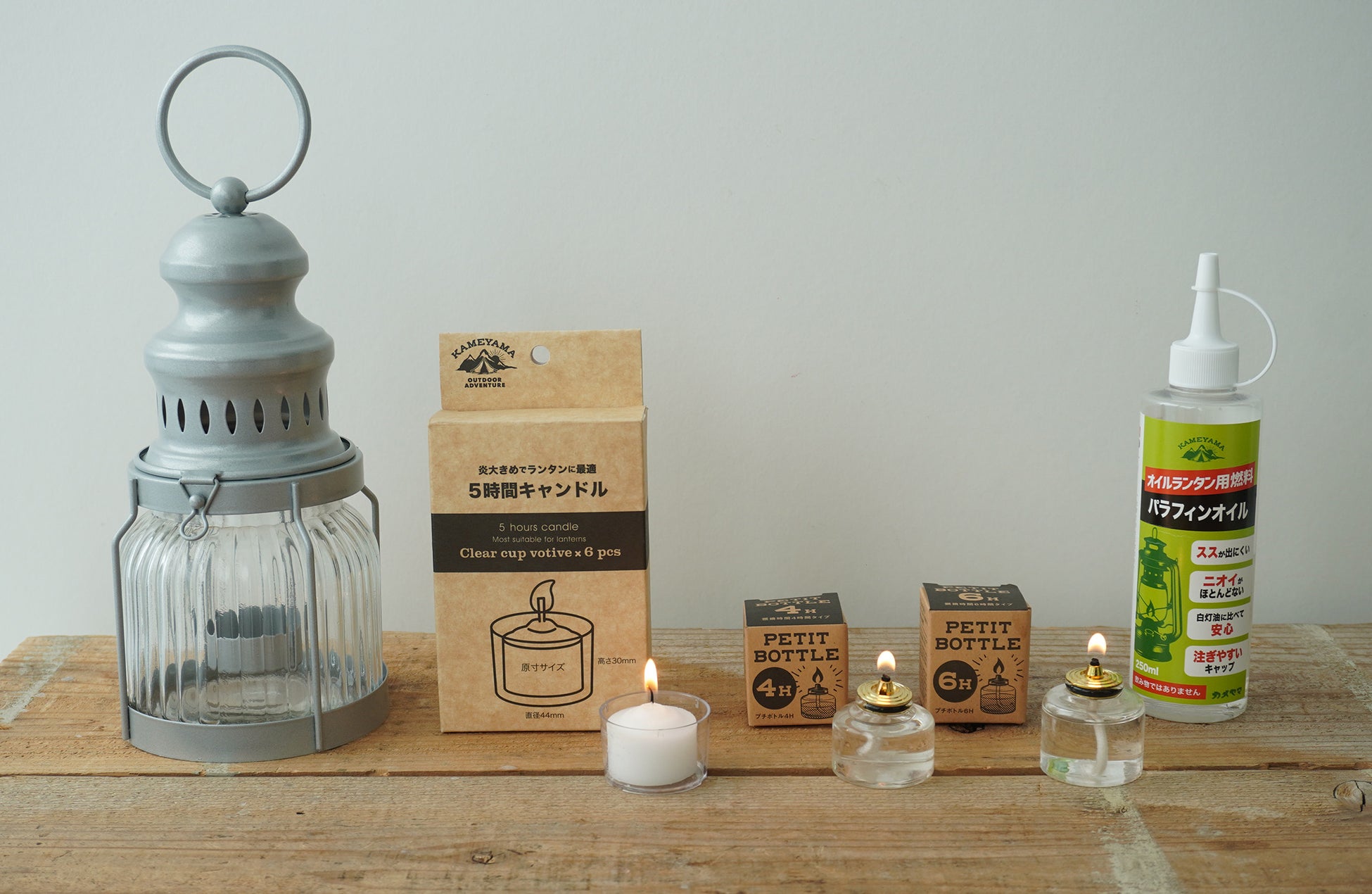 中に入れるキャンドルは、炎が大きめでランタンに最適なカップ入りキャンドル「5時間キャンドル6P」や