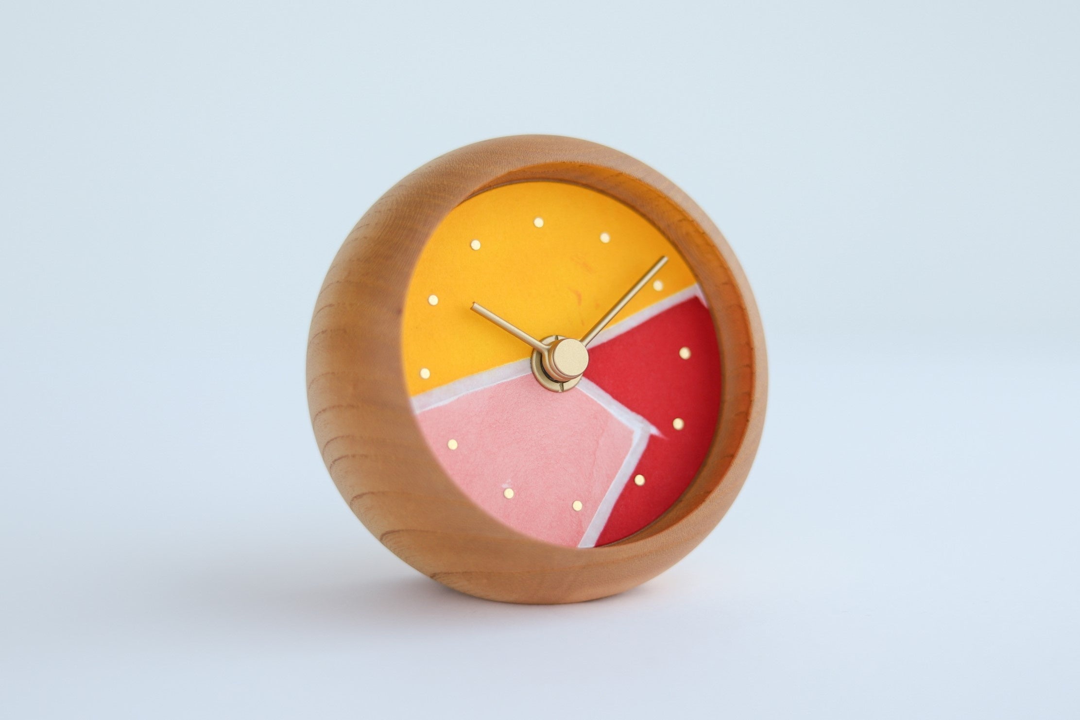漆器の産地として長い歴史を持つ、石川県加賀山中の「ろくろ引き」の技法で作られた、ケヤキの温かみのある時計。文字盤に貼られた青森ねぶたの和紙が美しい置時計です。