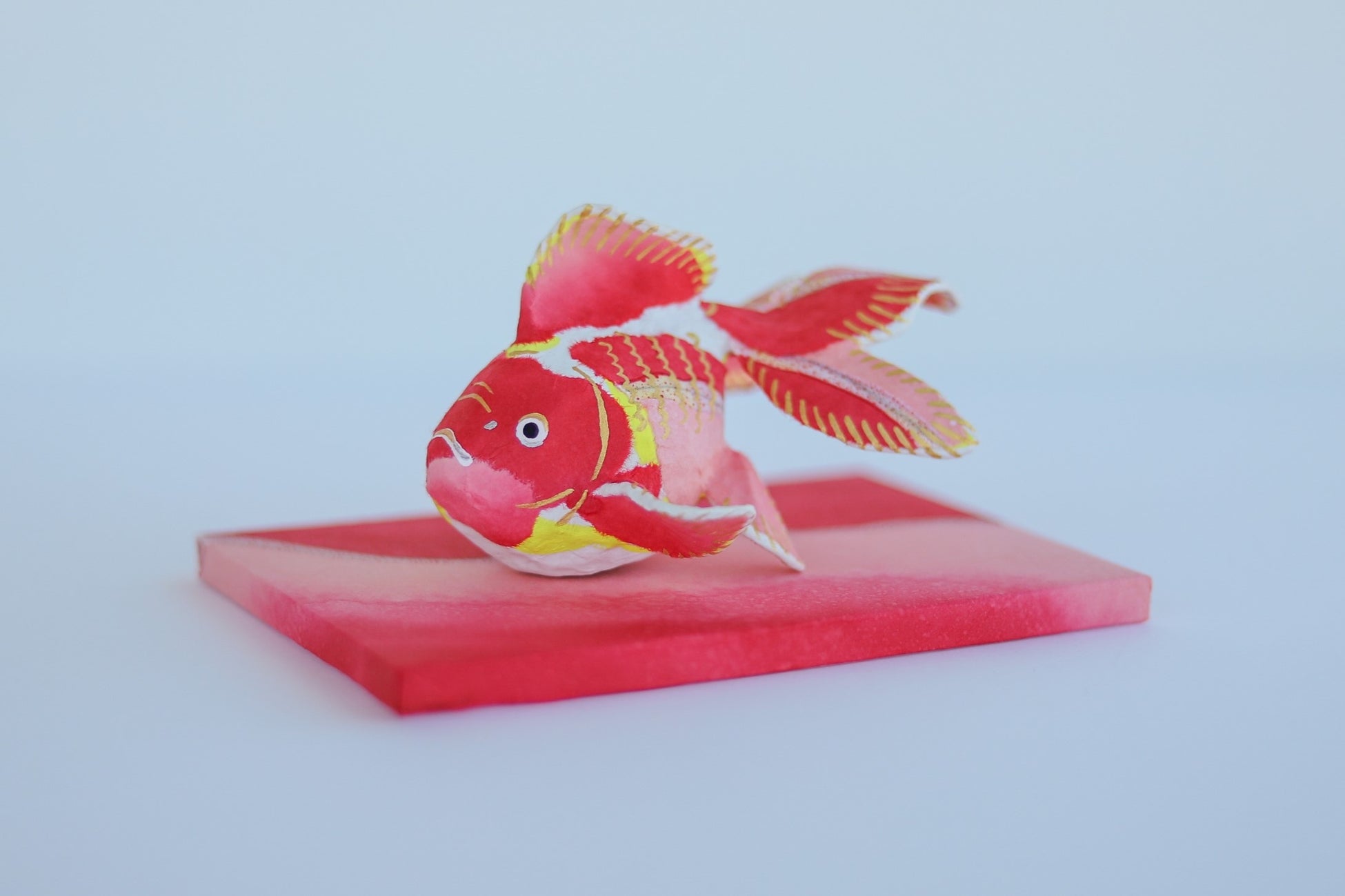 優雅に泳ぐ金魚の張り子。金魚の模様、揺れるヒレ、水中で光を受けて煌めく様子を、ねぶた和紙の蝋書きの線や彩色のグラデーションの美しさをそのまま活かしています。