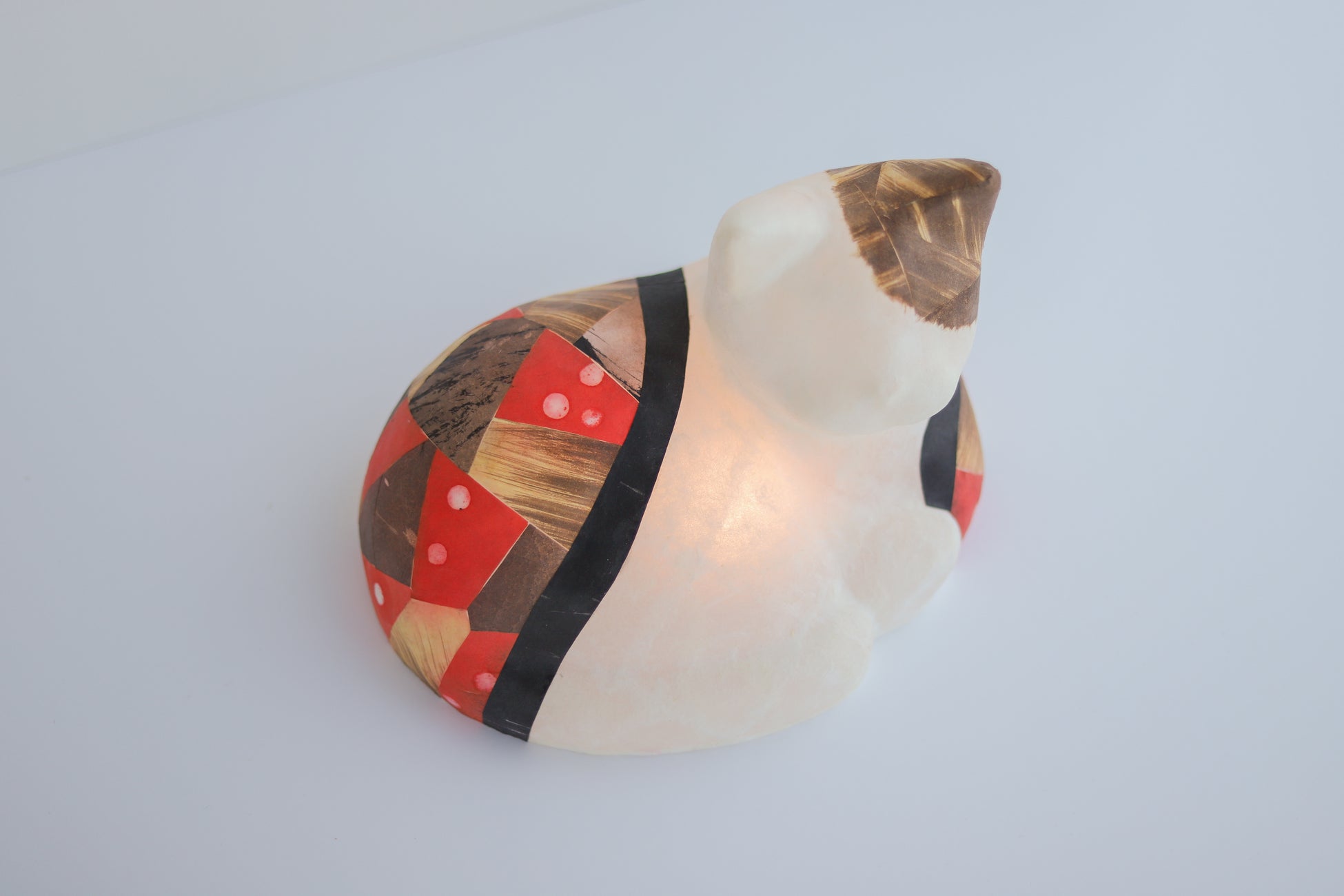 土佐和紙で作られた猫のランプにねぶたの和紙を羽織のように組み合わせました。とても魅力的な柄のねぶたの和紙をカットし、モザイク柄の羽織りに。
