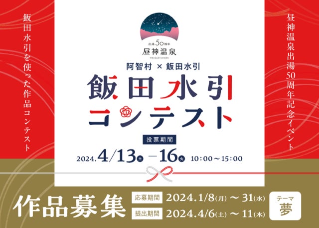 出湯50周年を迎えた今年度は、「昼神温泉出湯50周年記念 阿智村ライトダウン」、「昼神温泉出湯50周年記念 阿智村駅伝大会」などのイベント、特別宿泊プランの販売、記念グッズの販売など様々な取り組みを行ってきました。このたび、飯田市の伝統工芸飯田水引を使った「阿智村×飯田水引 水引コンテスト」を開催いたします。